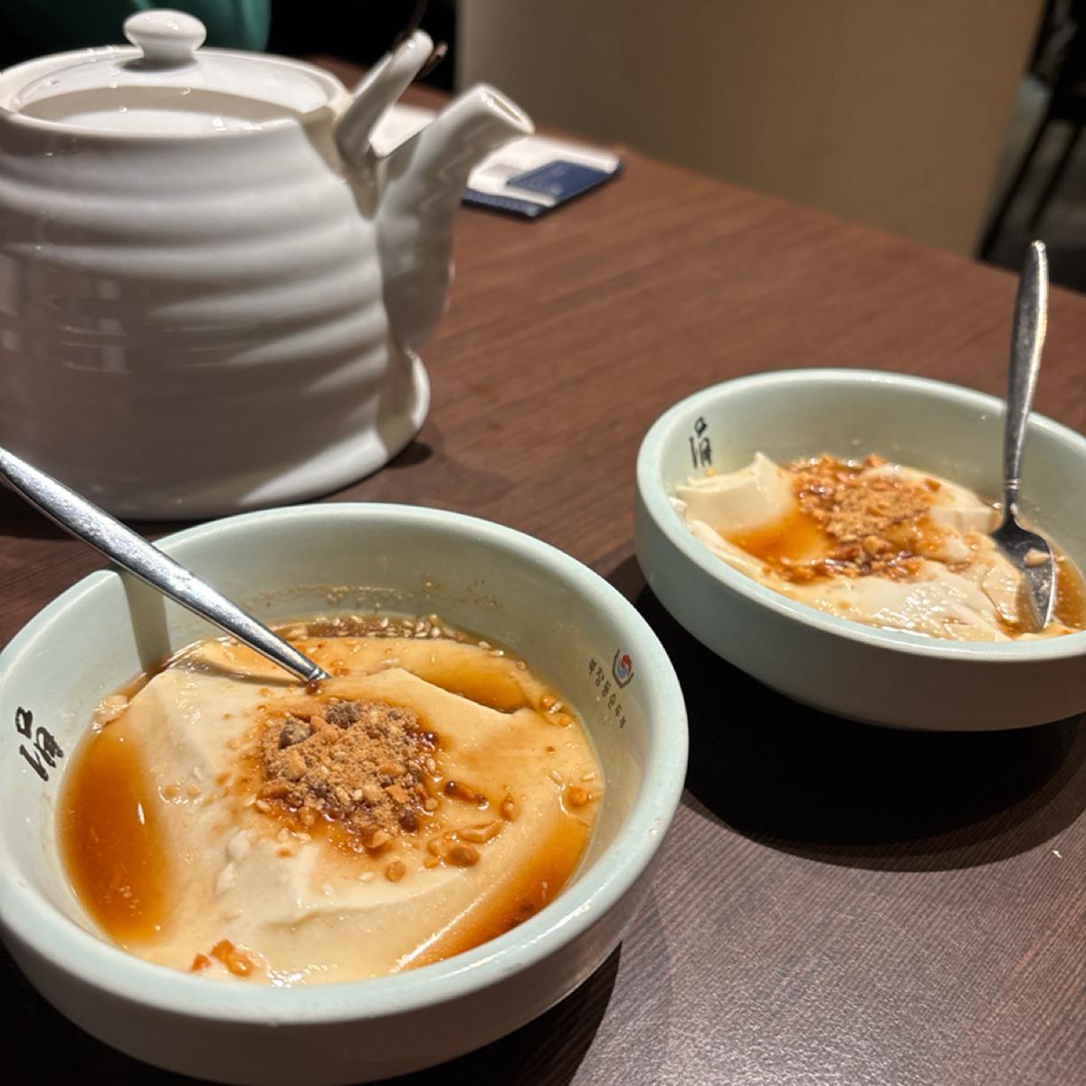 The final dessert features handmade tofu pudding, which has a texture that's more solid than the usual silky smoothness of tofu pudding, giving it a strong soybean aroma. The peanut flavor is prominent, though the brown sugar's sweetness is a bit lighter, making it overall refreshing and suitable as a simple ending to a meal. If you prefer desserts that aren't too sweet, this one would be an excellent choice.