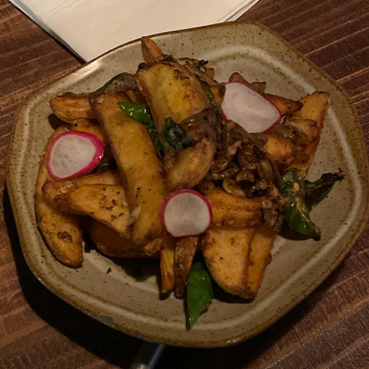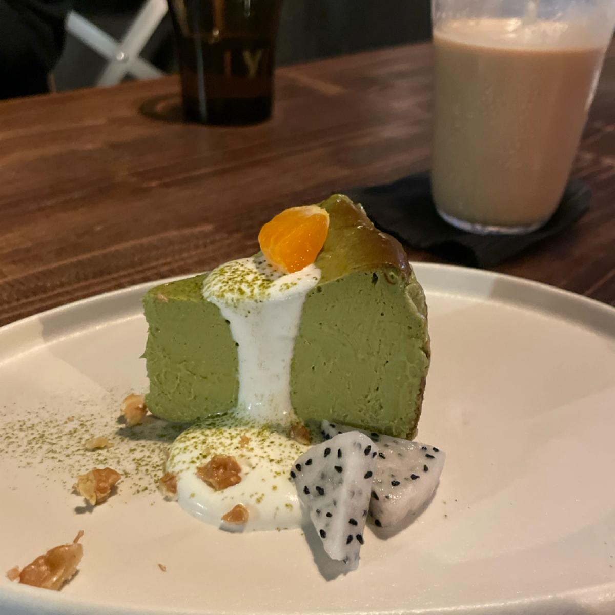 Later, we ordered sautéed potatoes with skin, which tasted seasoned like salty crispy chicken—quite strong in flavor. For dessert, we ordered matcha Basque cheesecake; it wasn’t bitter or overly sweet, and the texture in the middle was smooth. I thought it was good.