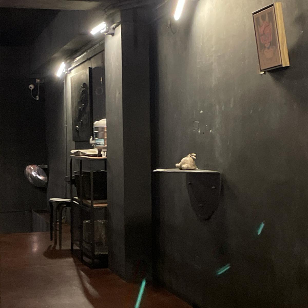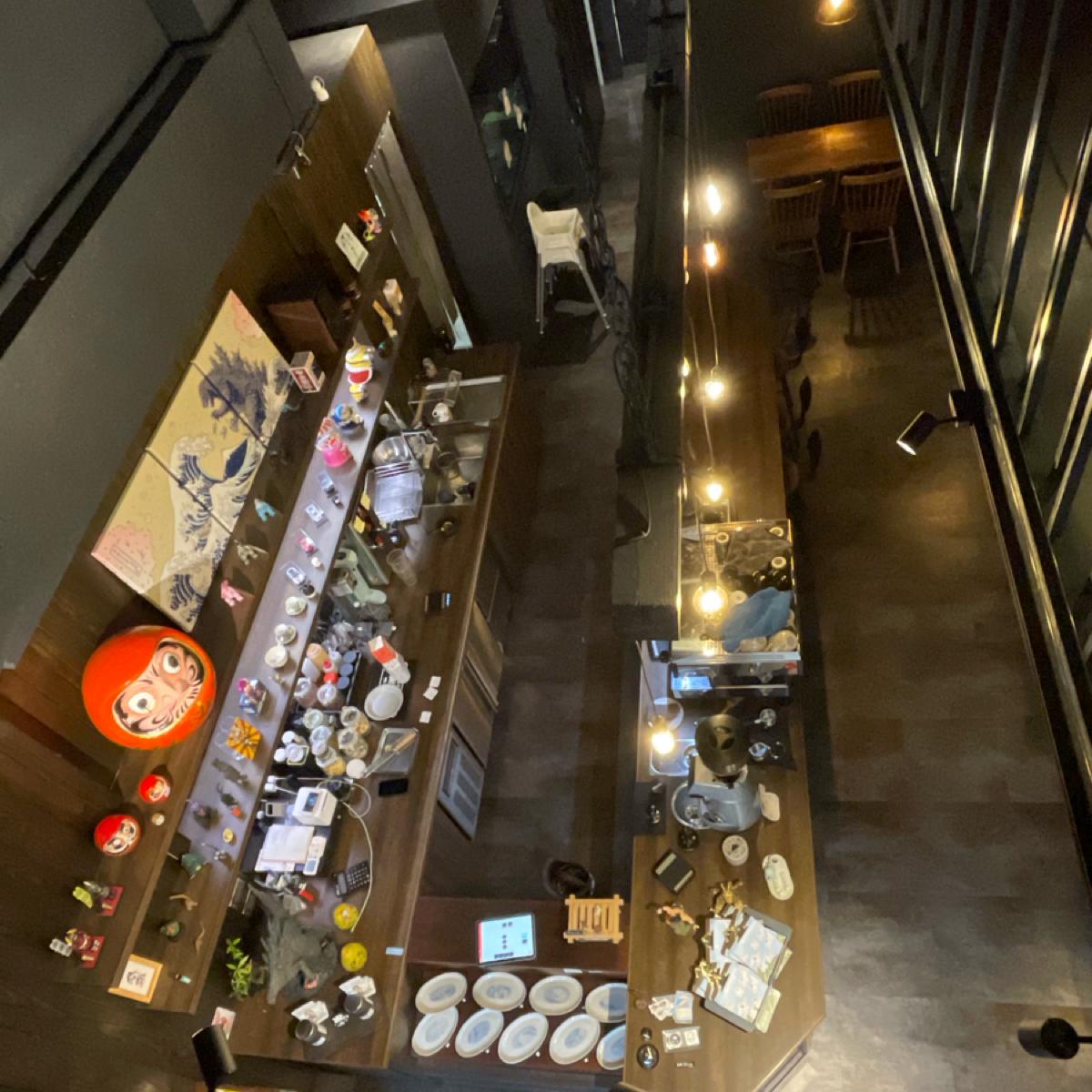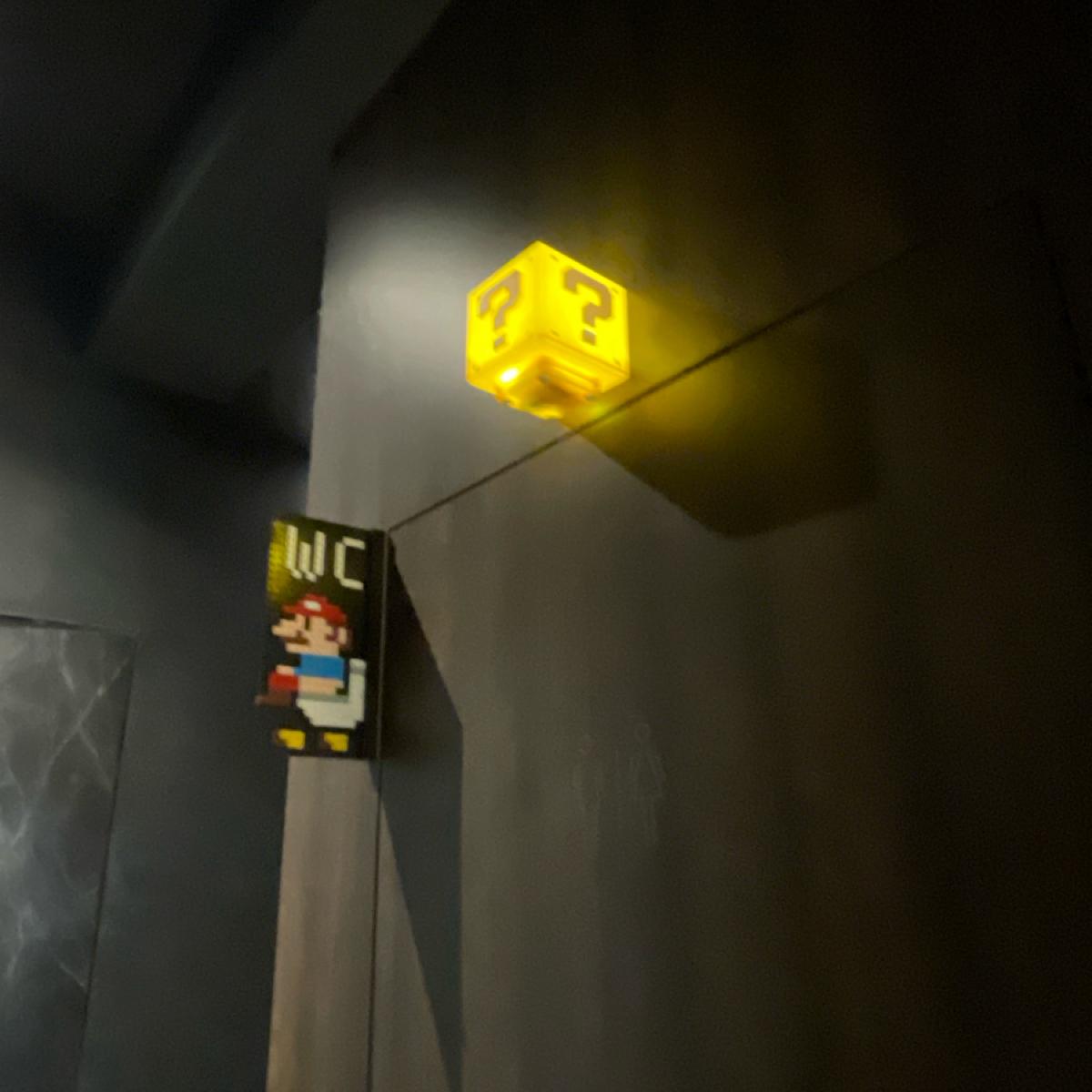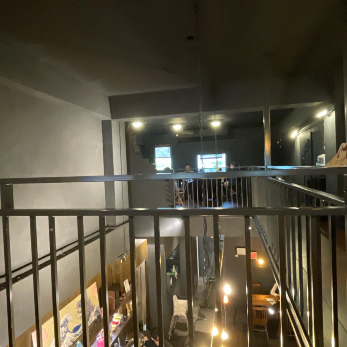 The interior has a very Japanese feel, and the dessert menu on the wall looks like something from a Japanese magazine. The overall decor has an industrial style, and the space is somewhat dark, dominated by warm yellow lighting, which gives the interior a unique atmosphere, especially in the loft area. After climbing the stairs, the floor feels a bit delicate and creaks with movement, making me question my weight a bit 😂. From the second floor, you can see the staff preparing coffee downstairs, and the restroom sign featuring Mario is quite cute. There’s also a small exhibit and some items for sale in the café.