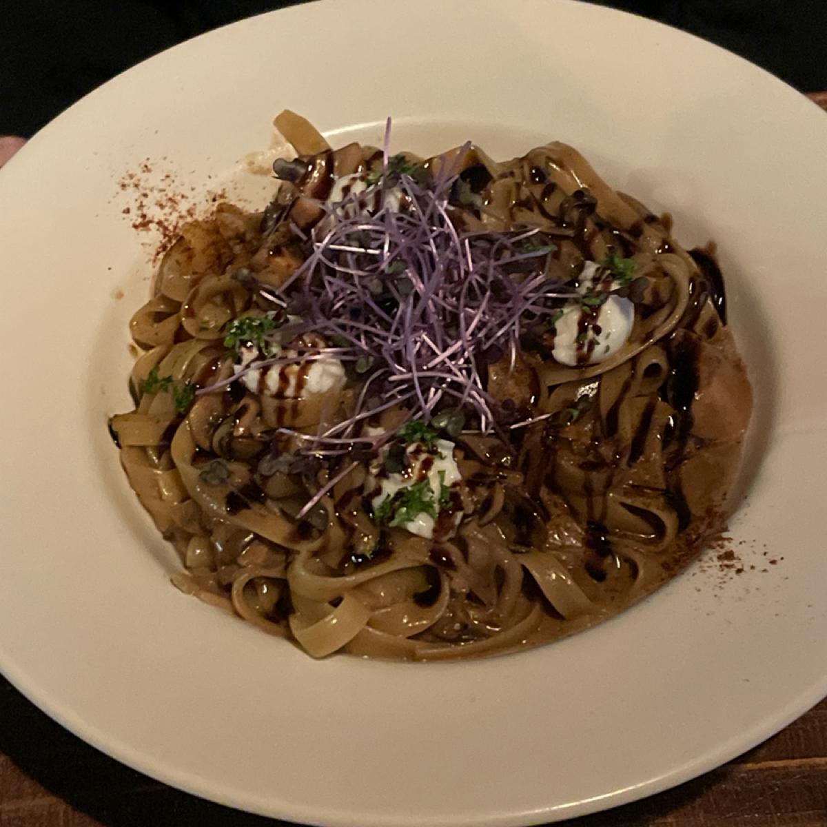 Once we got the menu, we looked for a seat and confirmed our orders before heading to the counter on the first floor to place our order, and we would pay when leaving. Since we hadn’t eaten anything, we were super hungry. I ordered spicy Korean-style mentaiko wide noodles, which was exactly to my taste. I love mentaiko; it was mildly spicy, and it had clams and shrimp, which I felt there were more of than I expected. The two large pieces of seaweed on top were arranged like in ramen, and the flavor was rich and quite delicious. The drink was an Earl Grey latte; I think the milk and tea ratio was fine, but it was quite unsweetened. My friend ordered the mascarpone mushroom cheese wide noodles, and I couldn't quite get into that flavor—it's not that it was bad, but I didn’t like it as much as the previous dish.