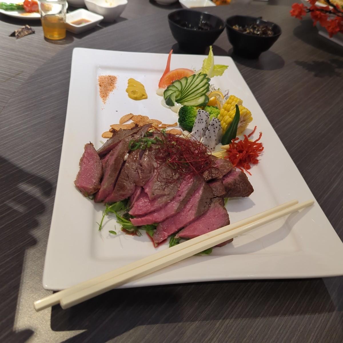 The beef is perfectly cooked, tender and tastes great. It comes with garlic slices, salt and pepper and honey mustard.