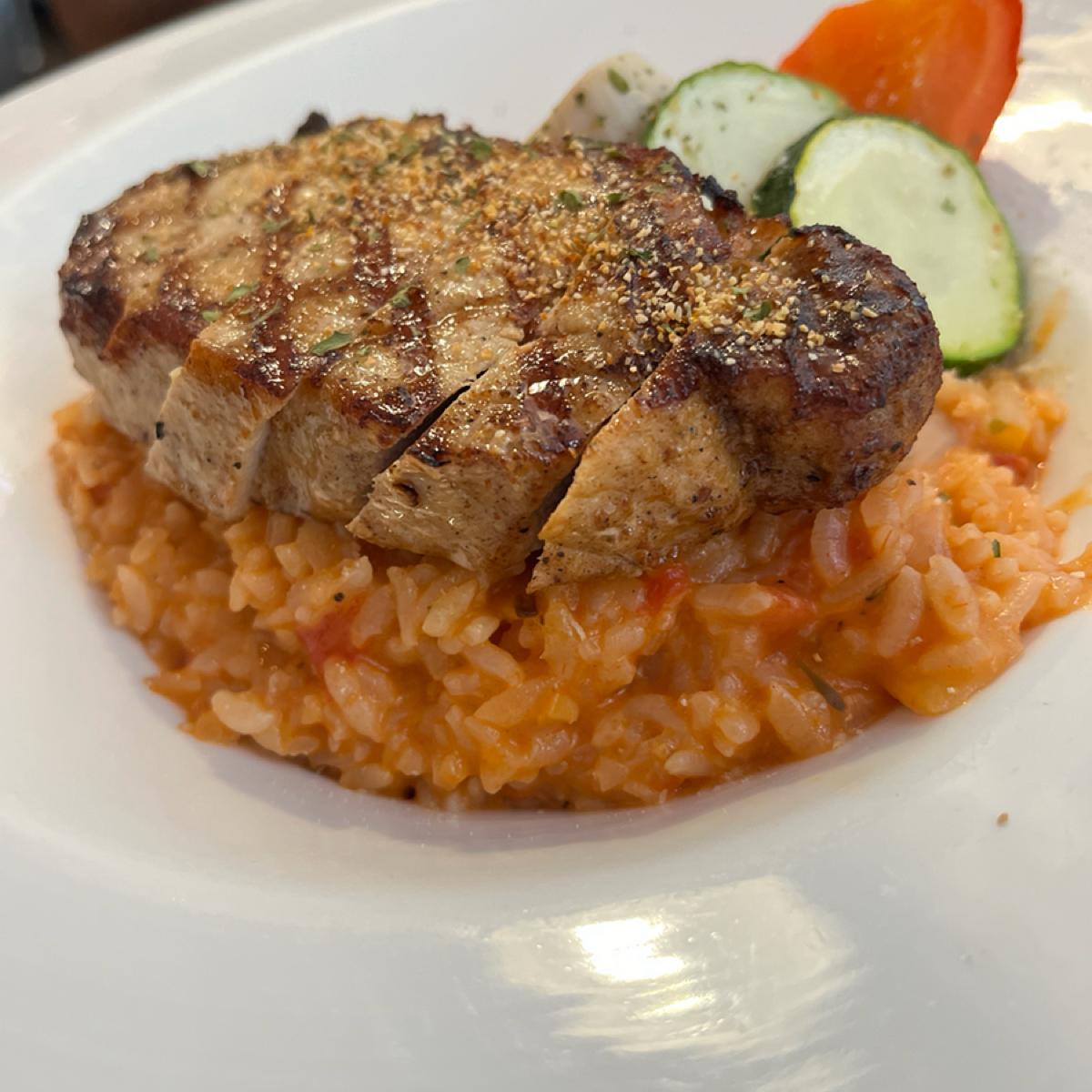 Pork Chops with Fresh Tomato Braised Rice The pork chops tasted a little dry, but the risotto was pretty good.
