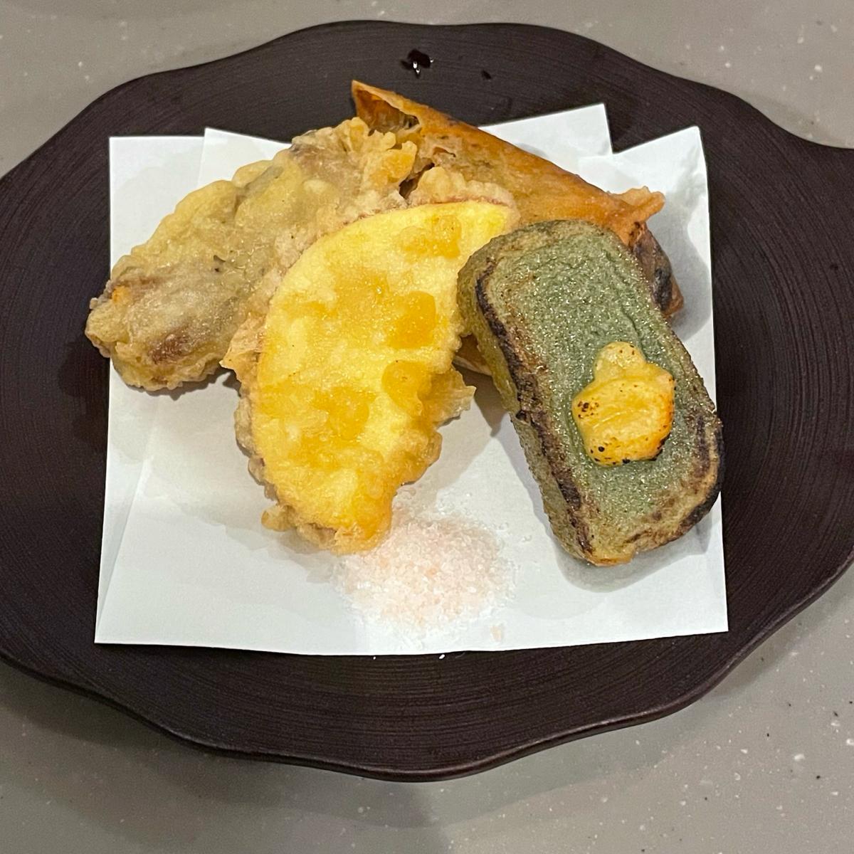 This dish was also a favorite of mine. It contained four pieces of fried items: sweet potato, duck, spring rolls, and matcha rice cake. Aside from the sweet potato, which is more common, the other ingredients were quite special, and everything was delicious.