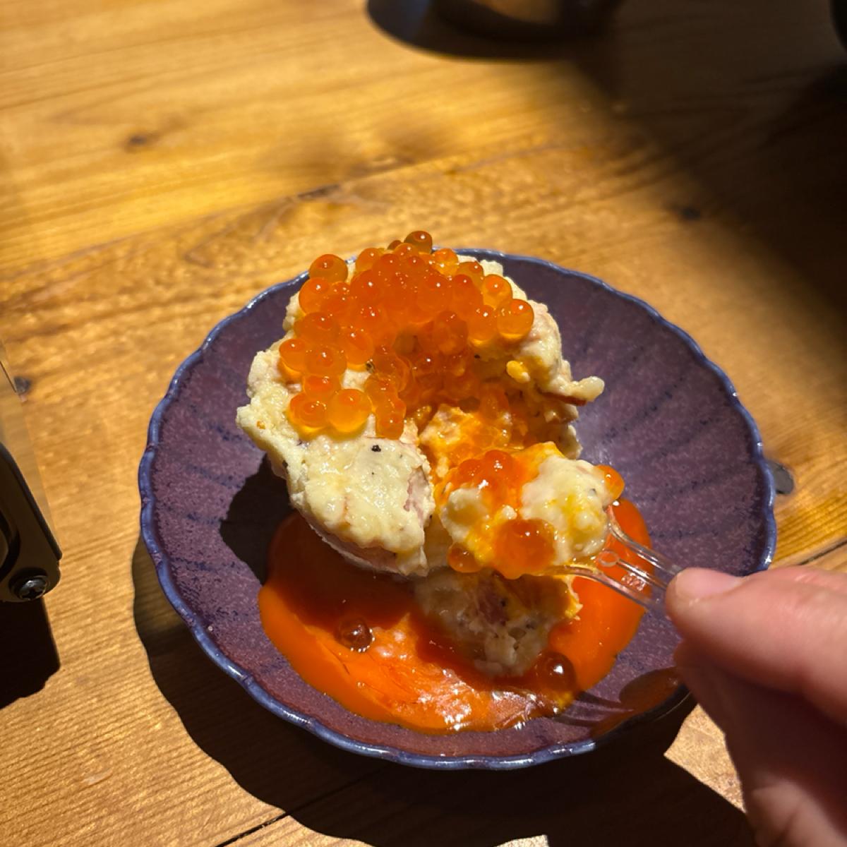 The potato salad decorated with sea treasures 🥔 had ikura (salmon roe) and egg yolk on top, and I broke the yolk to eat it. 🥚