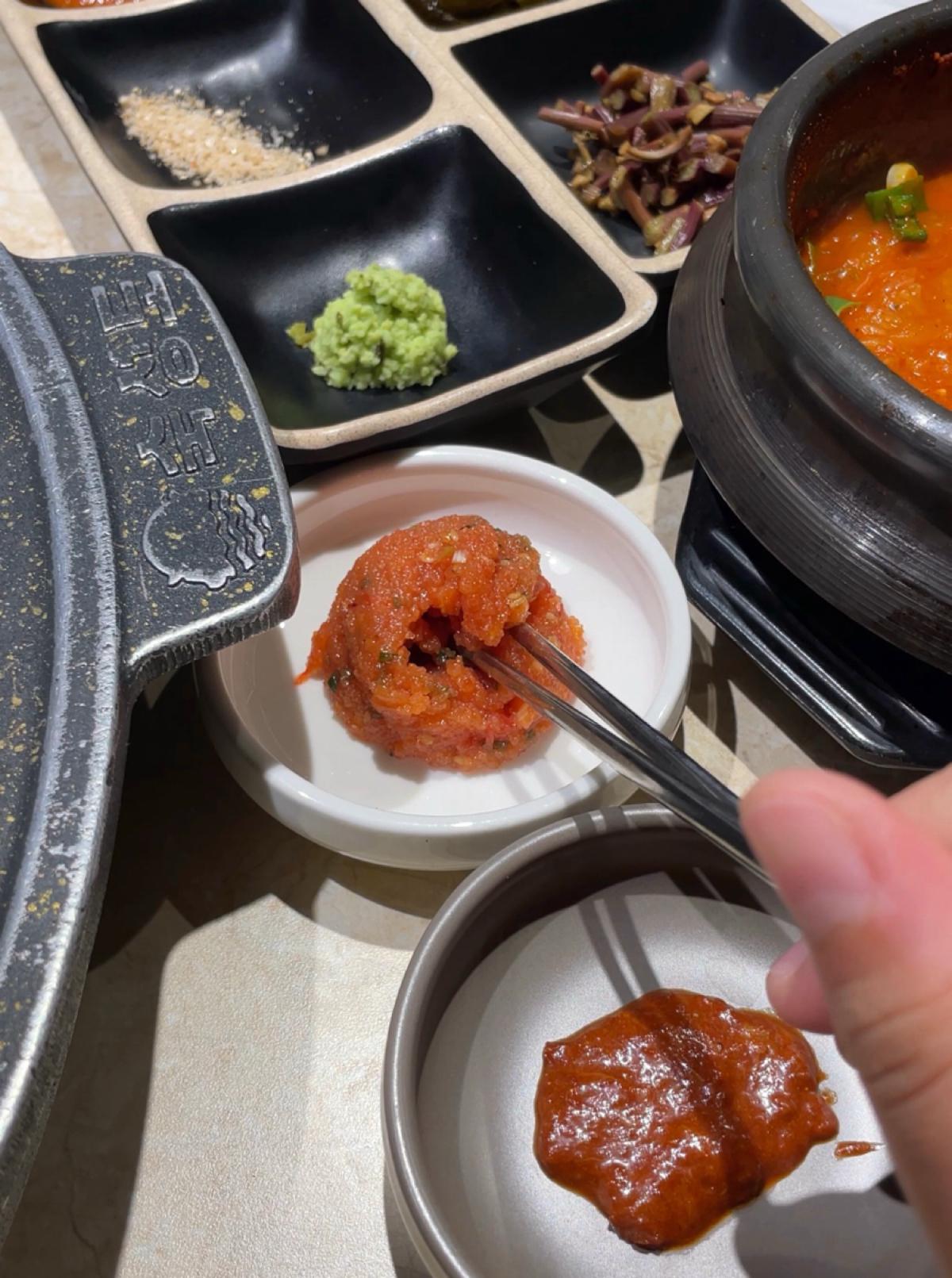 Their handsome hands looked nice (getting off-topic 🤗). They provided detailed explanations on how to enjoy the meal and even helped us with two types of sauce pairings. But I didn’t remember the names of each sauce... What left the deepest impression for me was the spicy cod roe and perilla leaves, which pair perfectly with the BBQ.