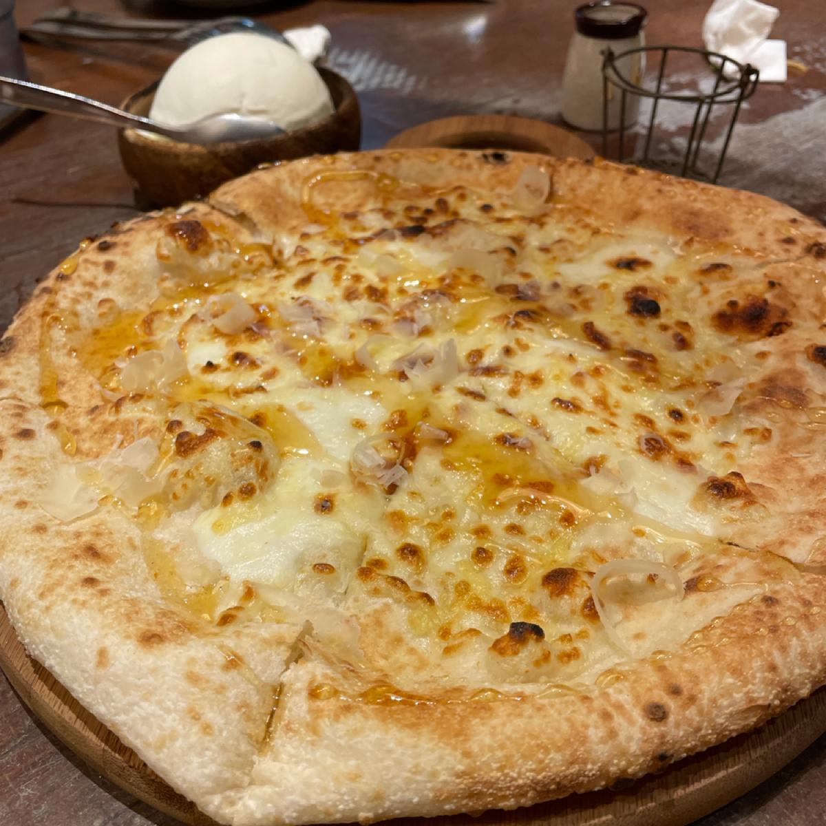 Pizza with a cheese base and paired with honey and vanilla ice cream (a whole bowl of super big lump) will make you feel happy💓 Suitable for sharing with 4 or more people