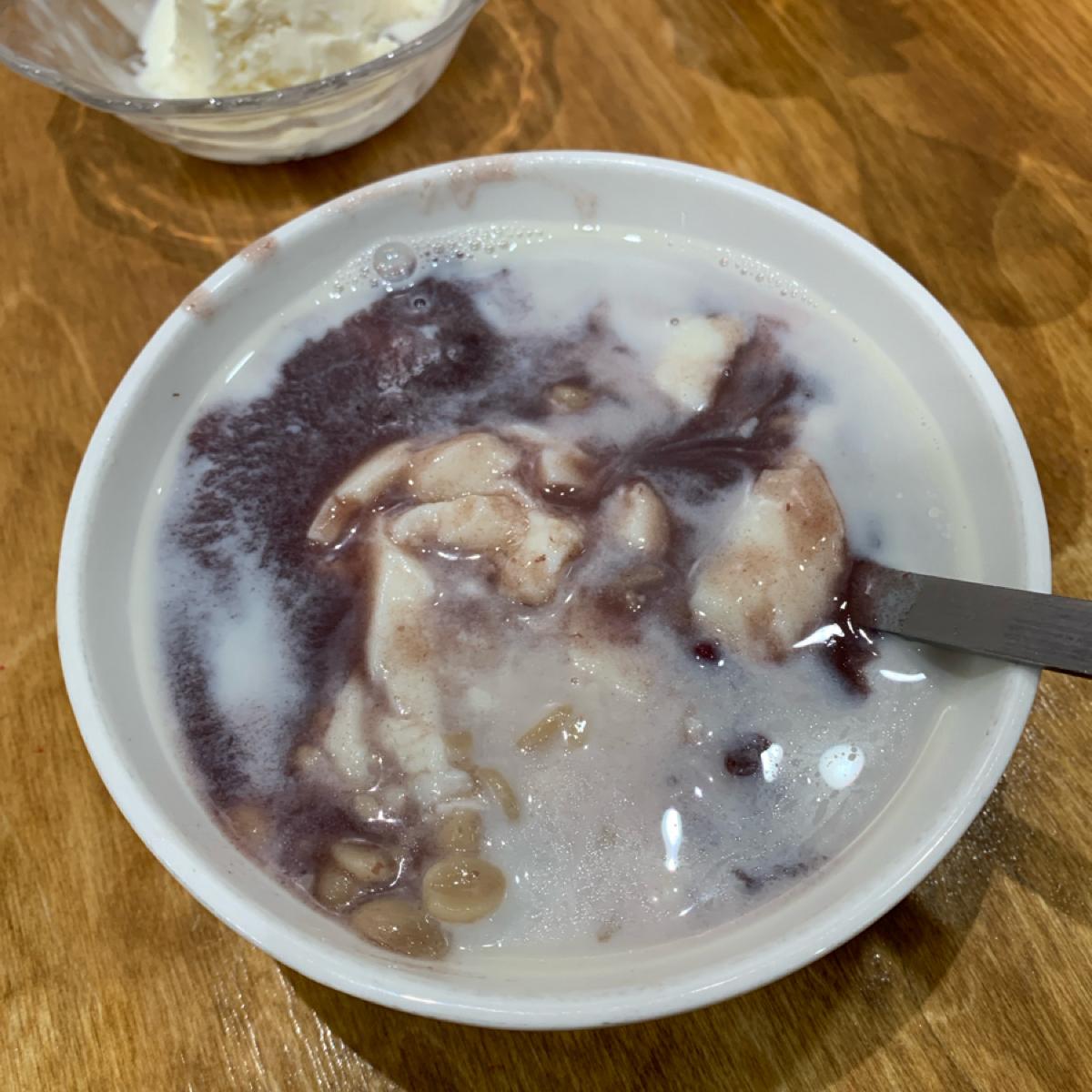 The red bean soup douhua with a little sugar and peanuts, as the owner mentioned, includes sweetened soy milk, resulting in a soup that resembles red bean paste. The soy milk is on the sweeter side, but it pairs perfectly with the soft and delicate douhua. The peanuts are slightly yellow and sweet, indicating they have been properly handled.