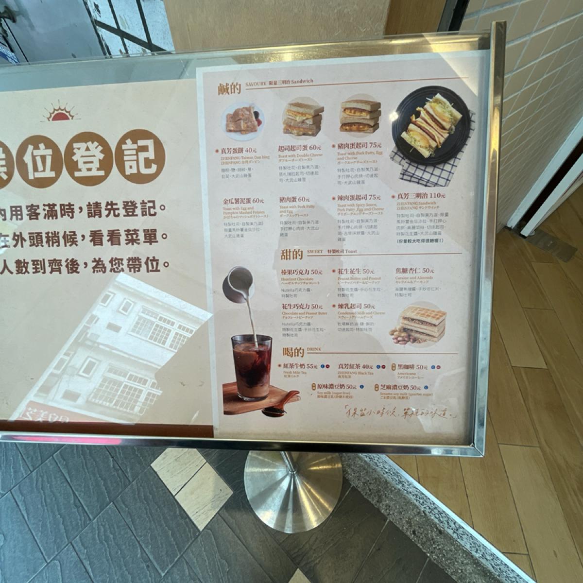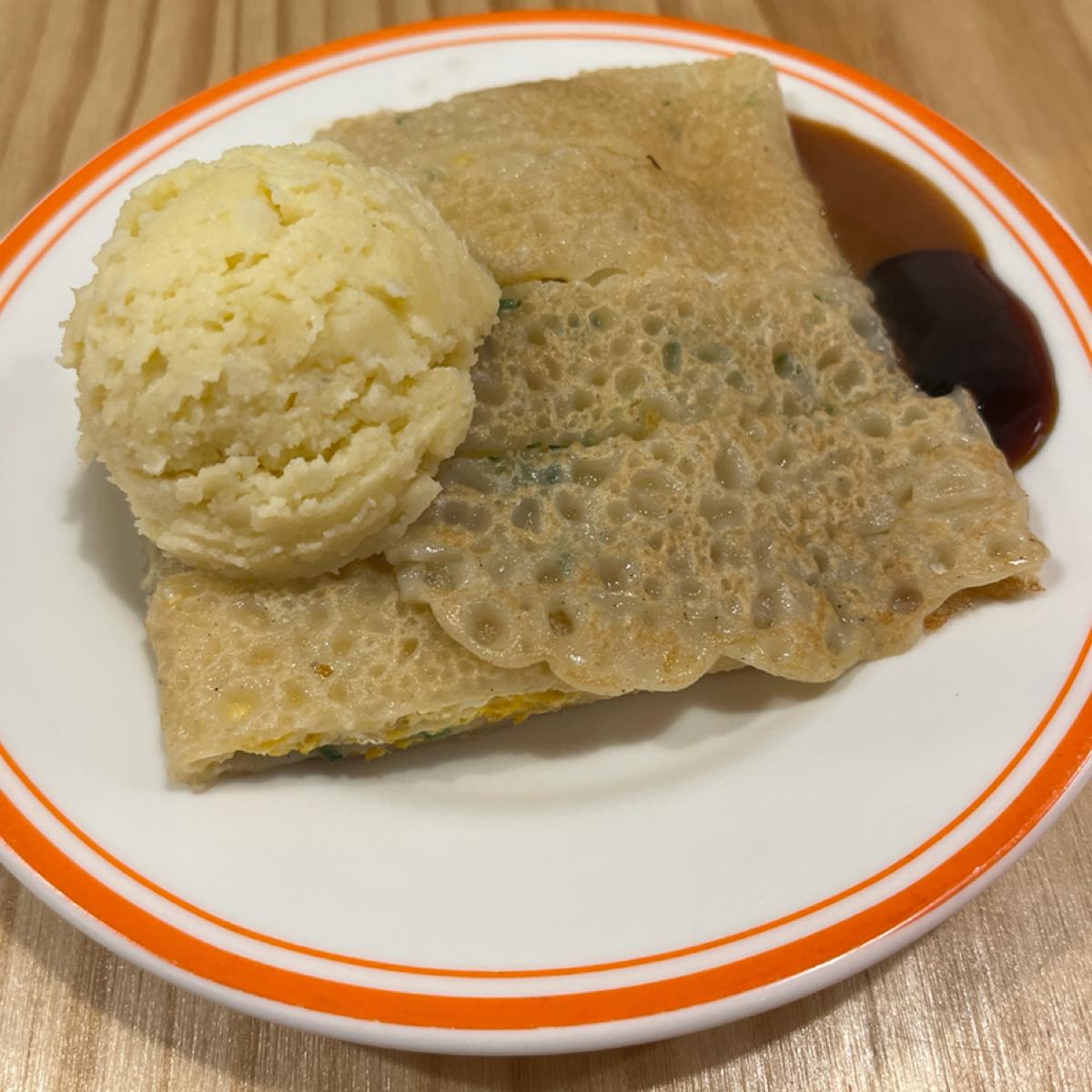 Zhenfang Egg Pancake is NT$40. It is a bit different from ordinary egg pancakes. It looks like a puff pastry crust with some air holes. It tastes soft and a bit thick. The crust has no flavor. It needs to be paired with some sauce, and more golden potato puree is added. The mashed potato has a grainy texture and is at a cool temperature. The mashed potato tastes light and refreshing.