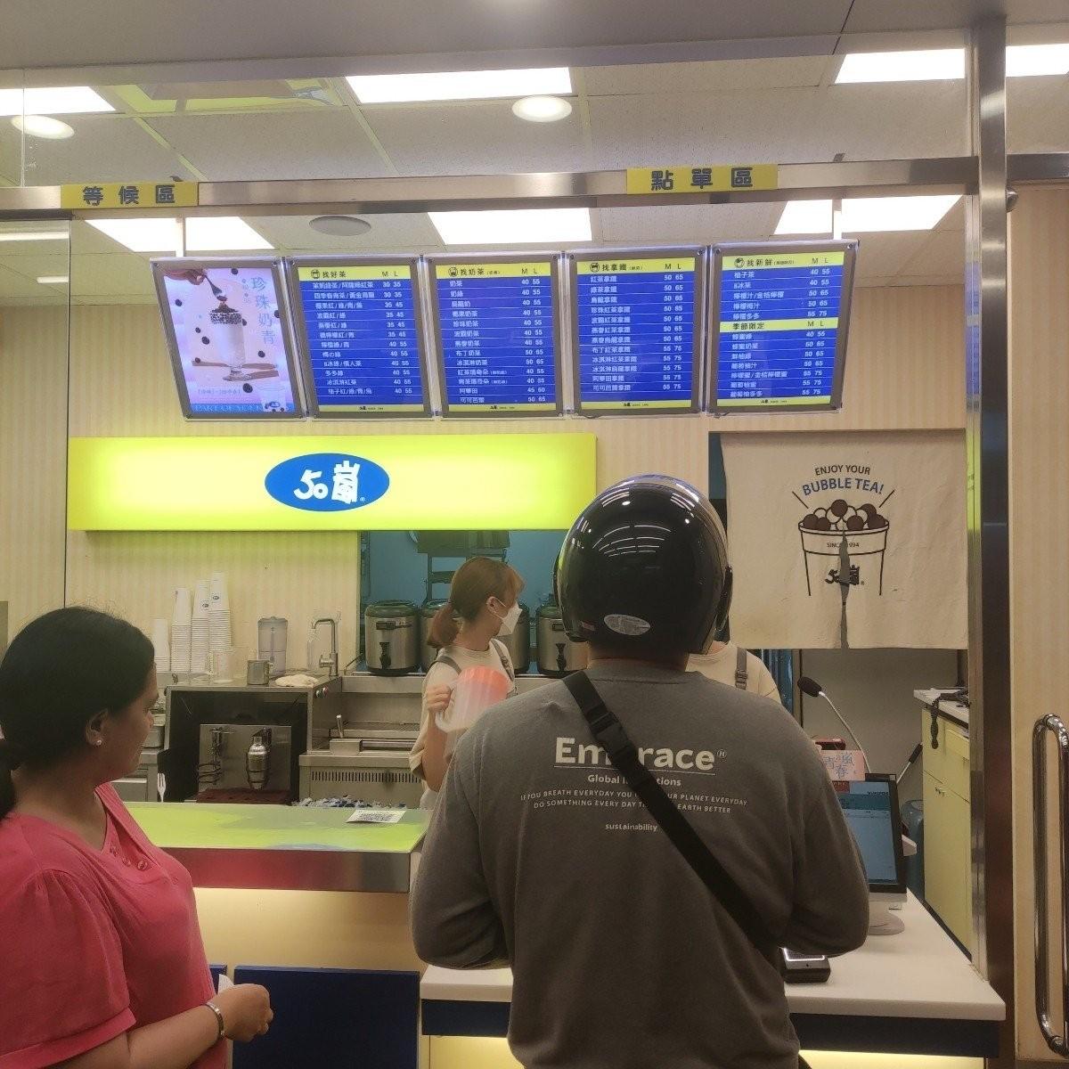 The 50 Lan sign with blue characters on a yellow background is a familiar chain beverage store. This store seems to have been open for a long time and has some signs of age, but overall it is still very clean and the service of the store staff is acceptable.