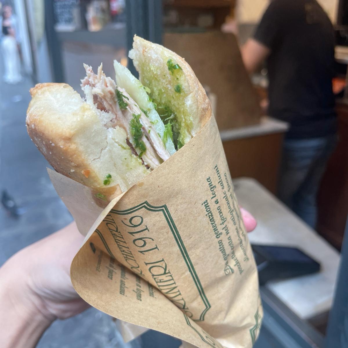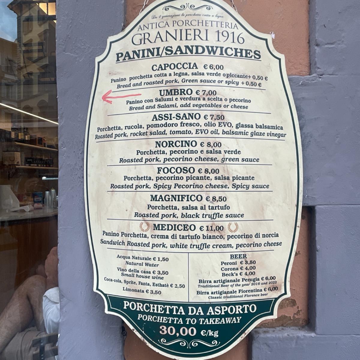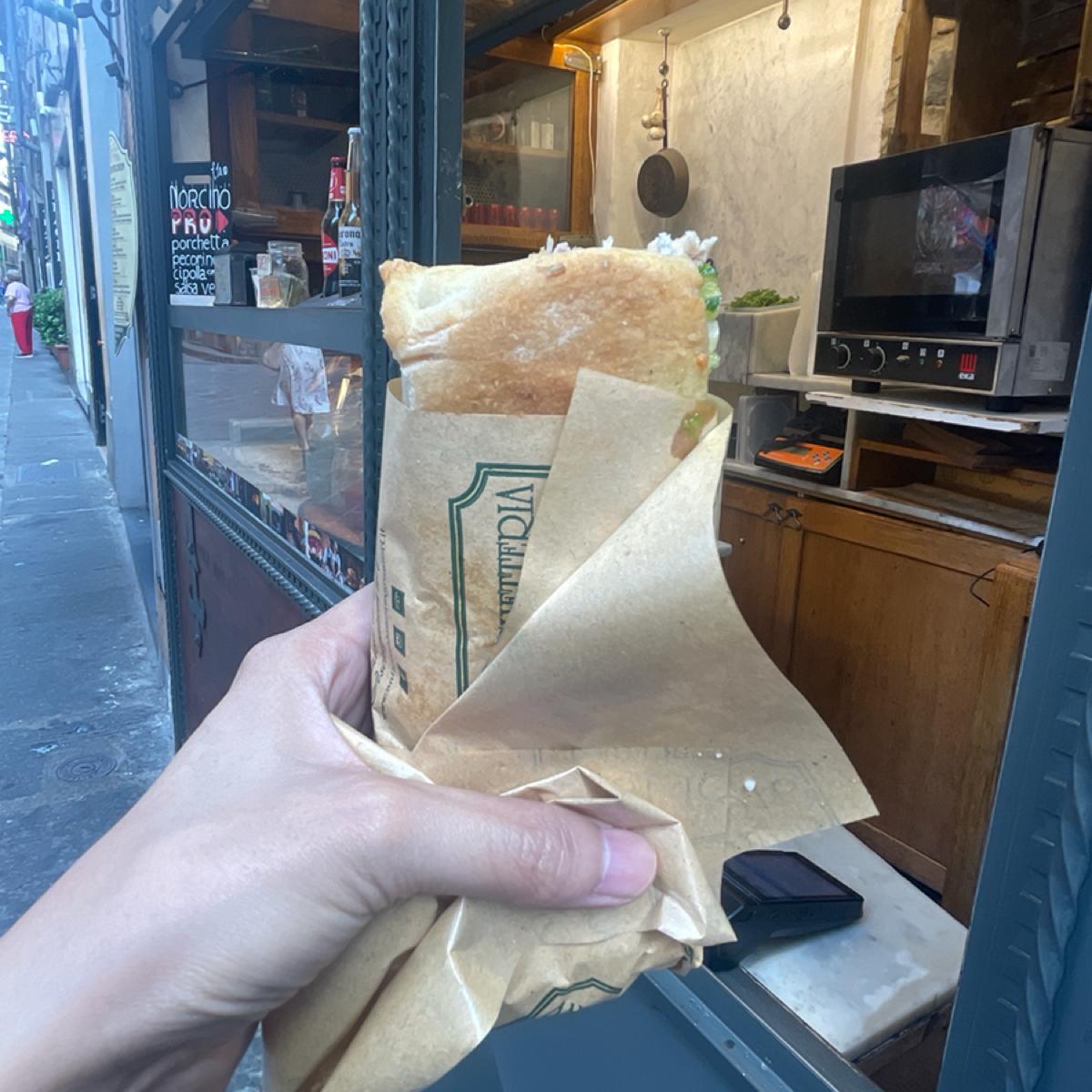 This roasted suckling pig sandwich shop "Antica Porchetteria Granieri 1916" is not far from Florence's Piazza della Signoria and the Wild Boar Fountain. There is actually a famous sandwich shop nearby called "All'Antico Vinaio", but we passed by it today I thought this small shop looked good. The counter window was transparent, and you could directly see the roast suckling pig placed there. It was quite eye-catching, so I decided to buy it and try it~