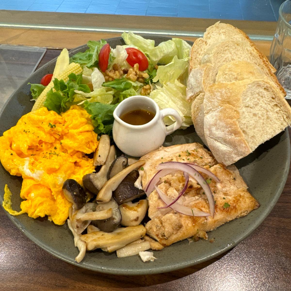 -Charcoal grilled chicken breast-300-The salad portion is quite satisfactory, there are not many dishes, and the salad dressing is salty and a little pulpy. There are many kinds of fried mushrooms and they are very fragrant. The amount of scrambled eggs is decent. The portion of chicken breast is not much, about 100 grams. It is marinated and slightly salty with a slight charcoal flavor, but it is not as soft and tender as Shufei. It has the texture of ordinary chicken. There are three large slices of farmer's bread. It has a natural aroma of grains after being baked, and the bread itself is quite regular.