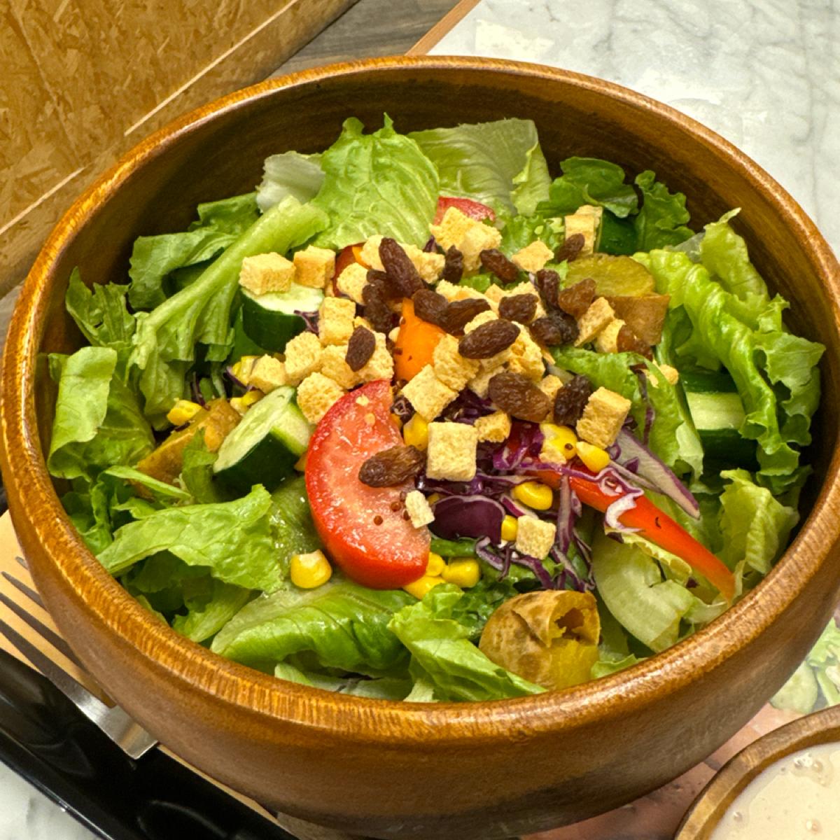 Garden fresh vegetable salad - Indoor wooden tub 155 - In addition to the common lettuce, there are also some purple cabbage, cucumbers, tomatoes, bell peppers, corn, etc. There are also quinoa, croutons and raisins sprinkled on top. There are three slices of iced sweet potato. The overall quality of the lettuce is pretty good. The portion size is enough for girls to feel full, but boys may need to add staple food or protein. For the sauce, I chose yogurt sauce with grapefruit flavor. The sauce will be enough for a large bowl. The sourness of the yogurt itself is not obvious, and the overall sweetness of the fruit is more.