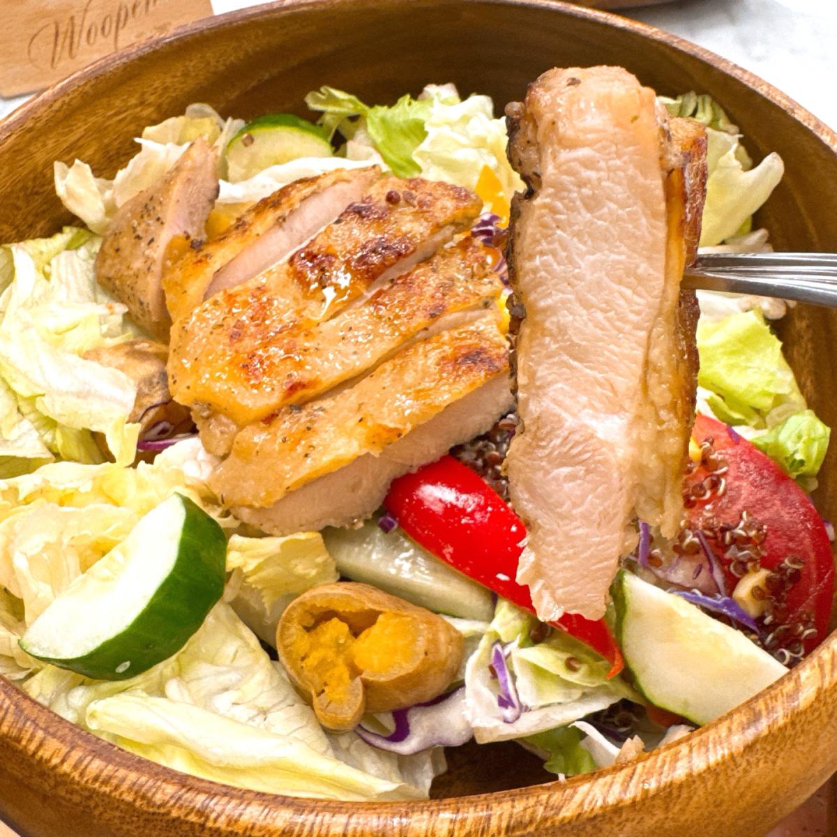 The dine-in portion differs from the take-out, with an increased serving size. The salad is served in a large wooden bowl, which reflects the shop's name. The grilled chicken thigh has a rich pepper and sauce flavor, and while tender, it doesn't retain much juice. The salad base consists of a variety of lettuce, complemented by sweet peppers, sweet potatoes, cucumbers, tomatoes, and red onions, topped with some red quinoa. It is truly a hearty bowl filled with dietary fiber.