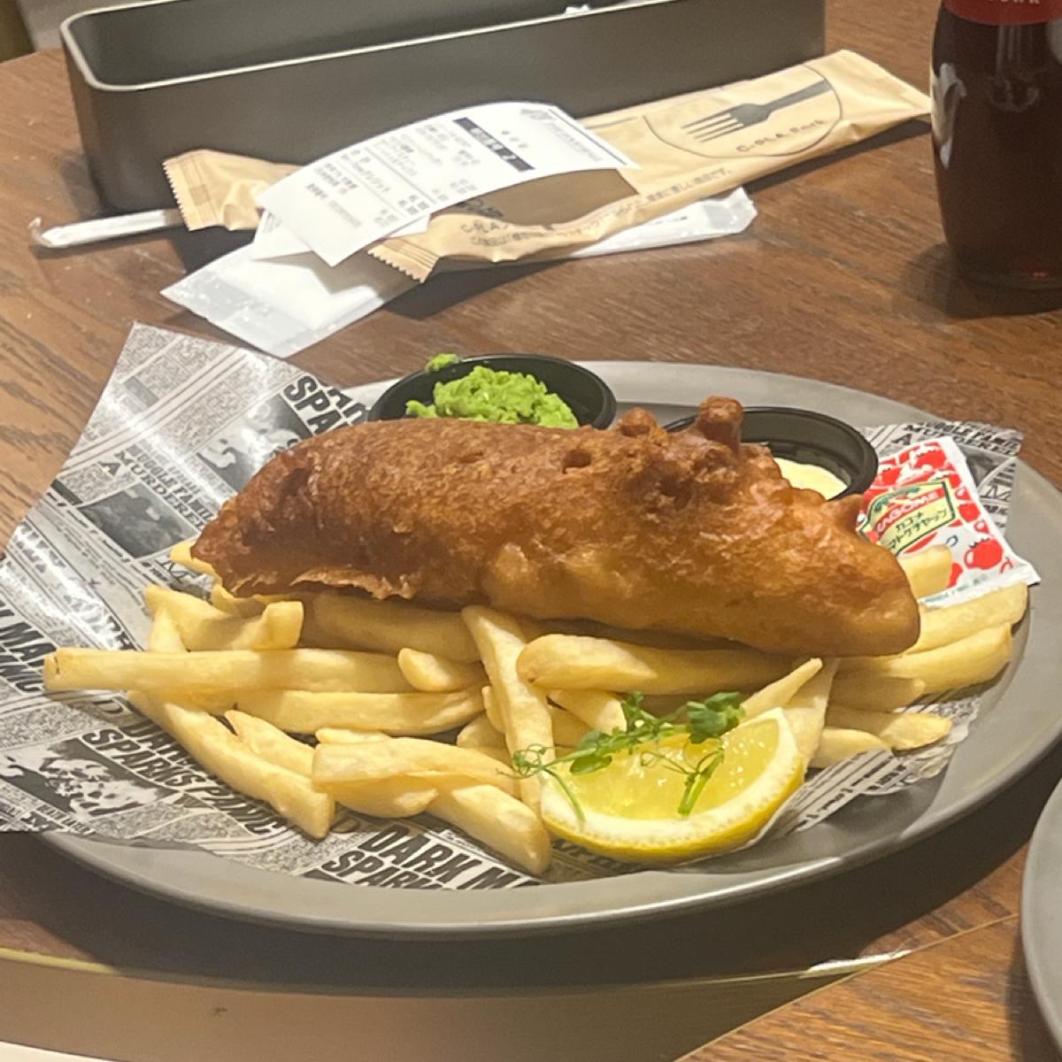 Fish and Chips for 1800 yen. The fish batter tasted quite unique, and the fish itself was large, though getting a bit heavy to eat as we went on. It paired nicely with the edamame it came with, and the fries were soft.