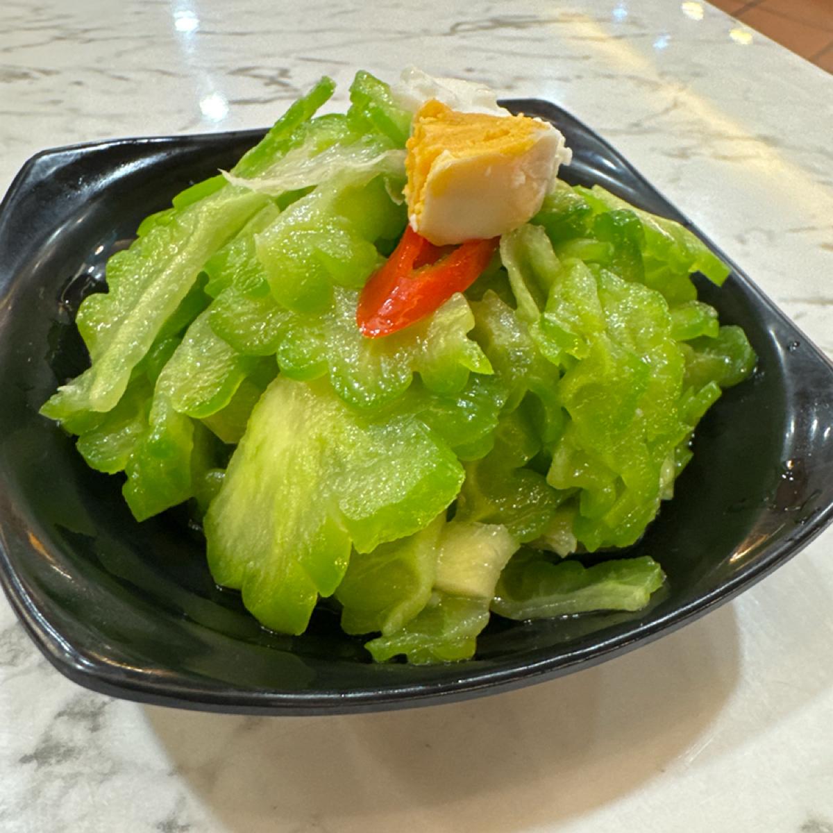 The salted egg with bitter melon is refreshingly crispy, and its vibrant green color is quite appetizing; the aroma of sesame oil is even more tempting, though if you keep eating, it might feel slightly salty after a while.