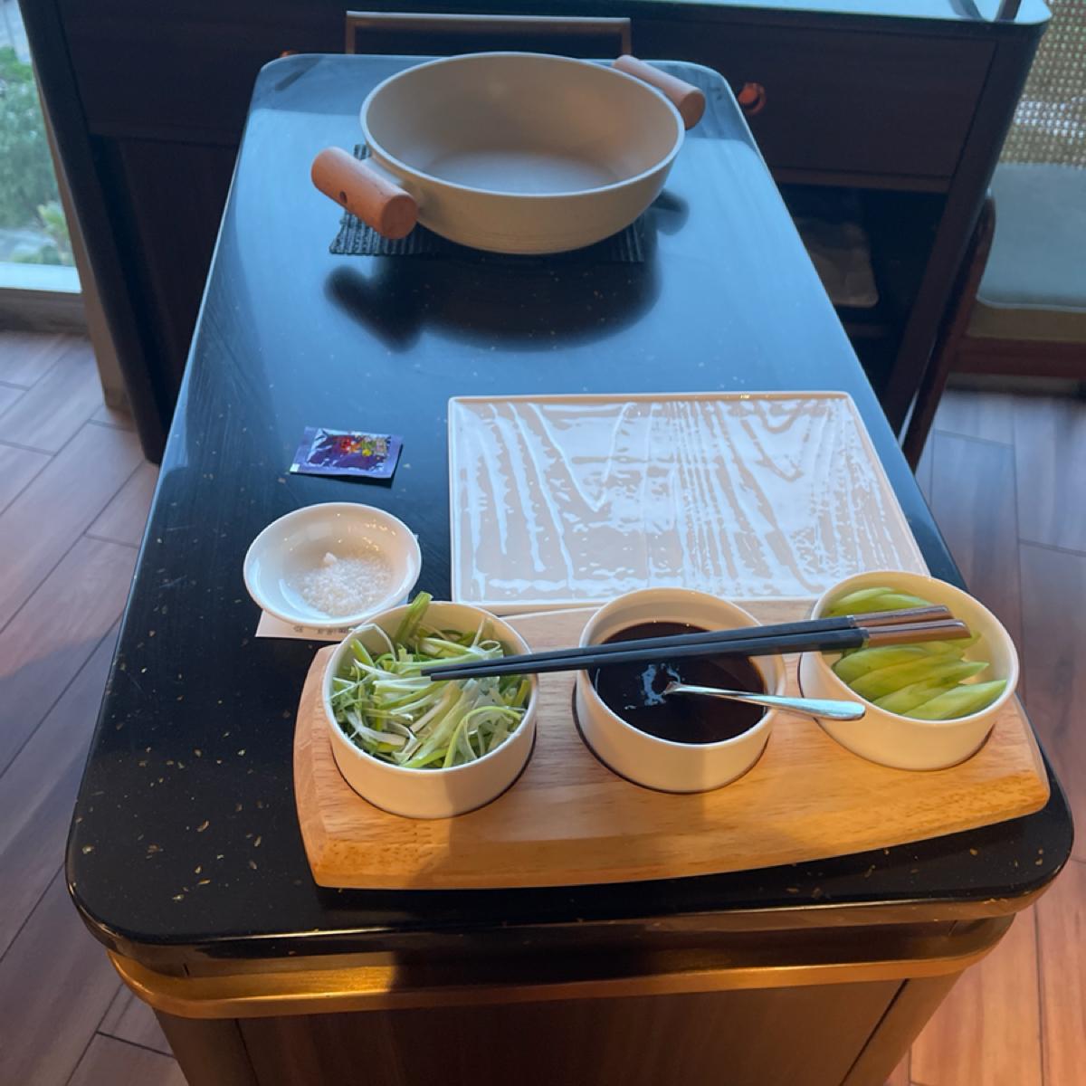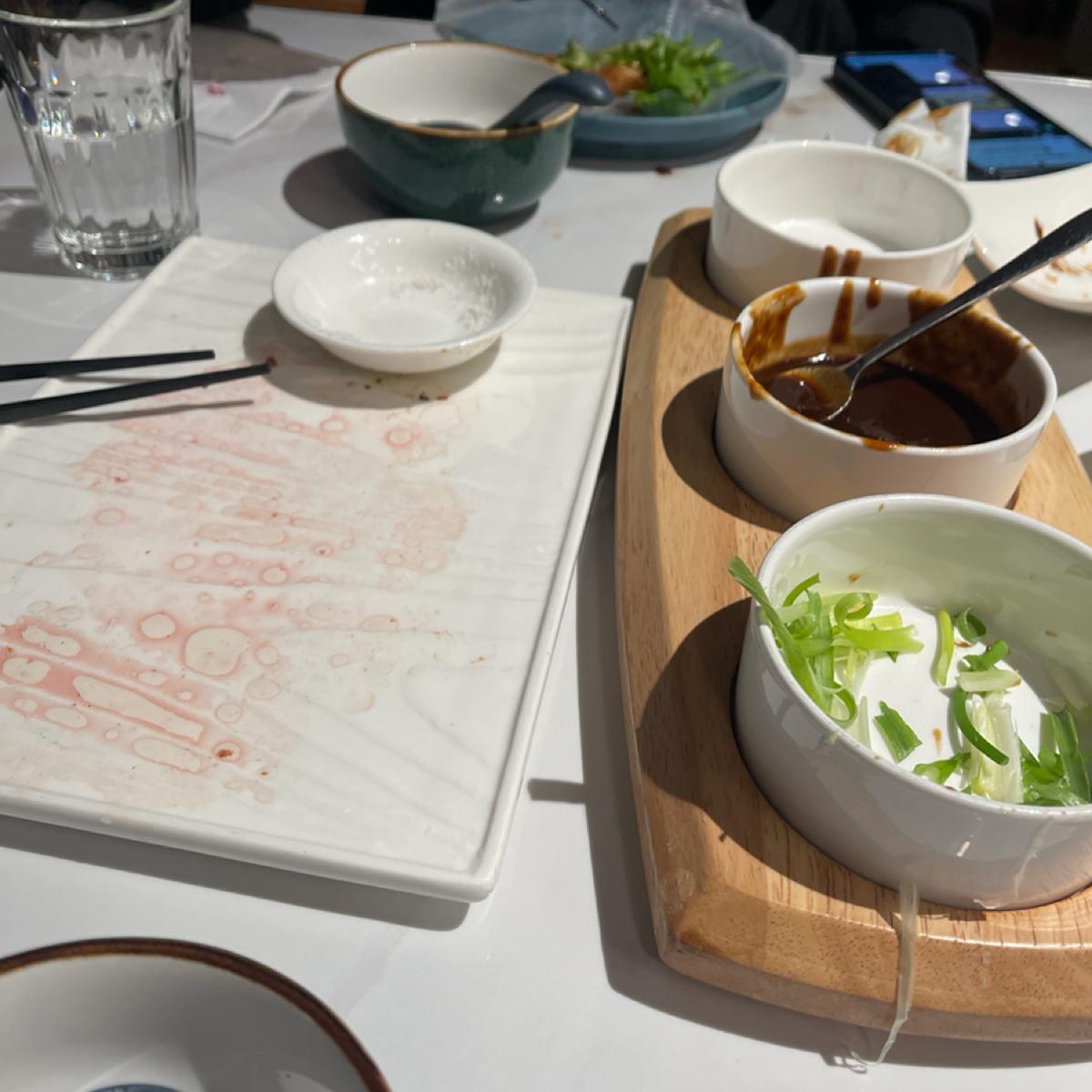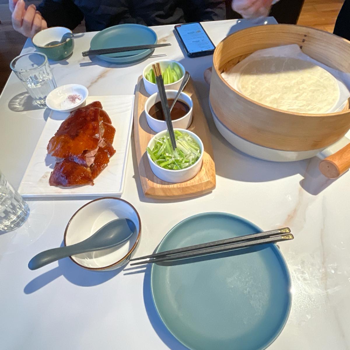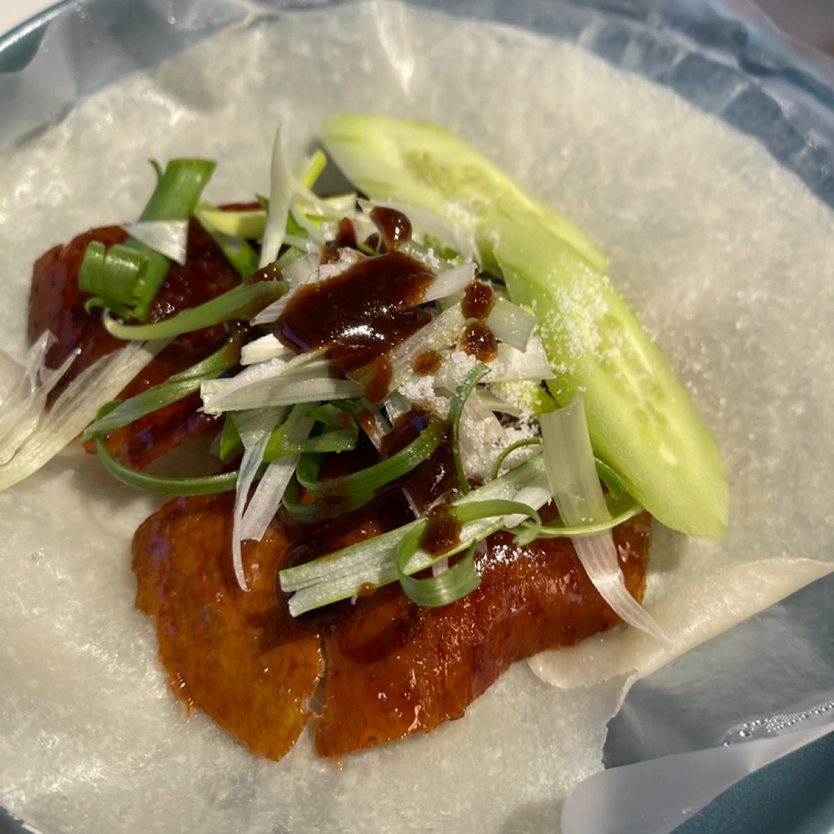 One plate of sliced roast duck + 6 pancakes + condiments,