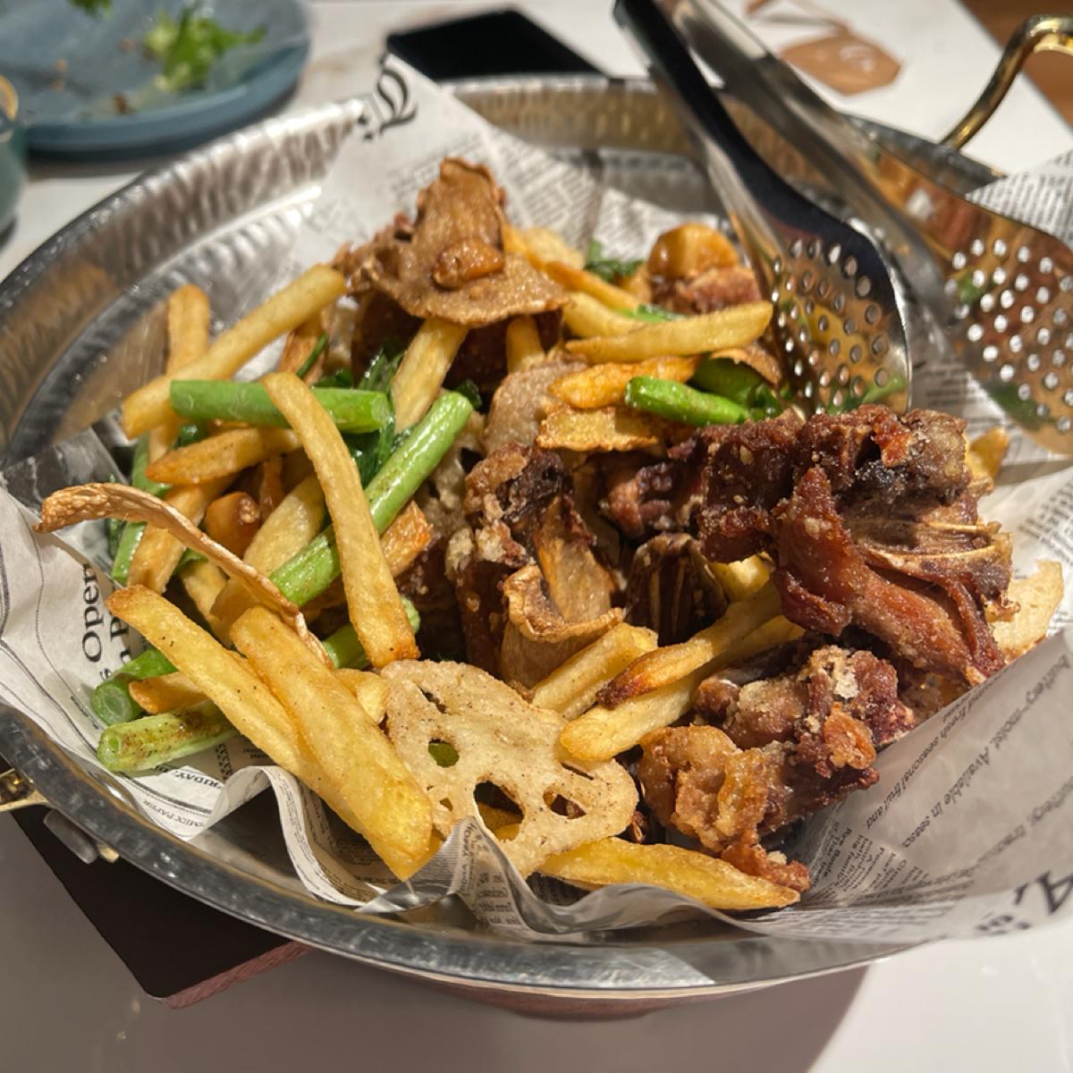 Inside, besides the duck bones, there are fried potato sticks, lotus root slices, and green beans…