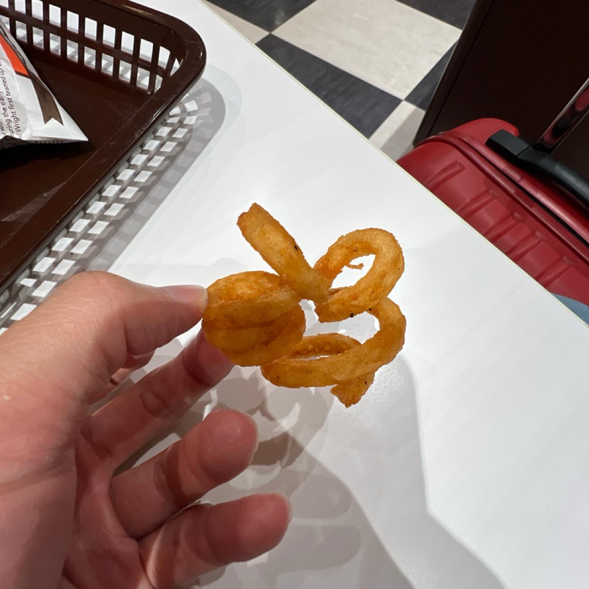 The burger itself didn't disappoint either, with rich cheese, a special sauce, bacon, a thick meat patty, and crispy fried onion rings, making for a richly layered experience. Each bite encapsulates the essence of American fried food style, satisfying for those who enjoy strong flavors. The fries and onion rings that came with the combo were also fried to a crispy texture. Personally, I'm a "no salt, no dip" person, simply enjoying the taste of the potatoes themselves.