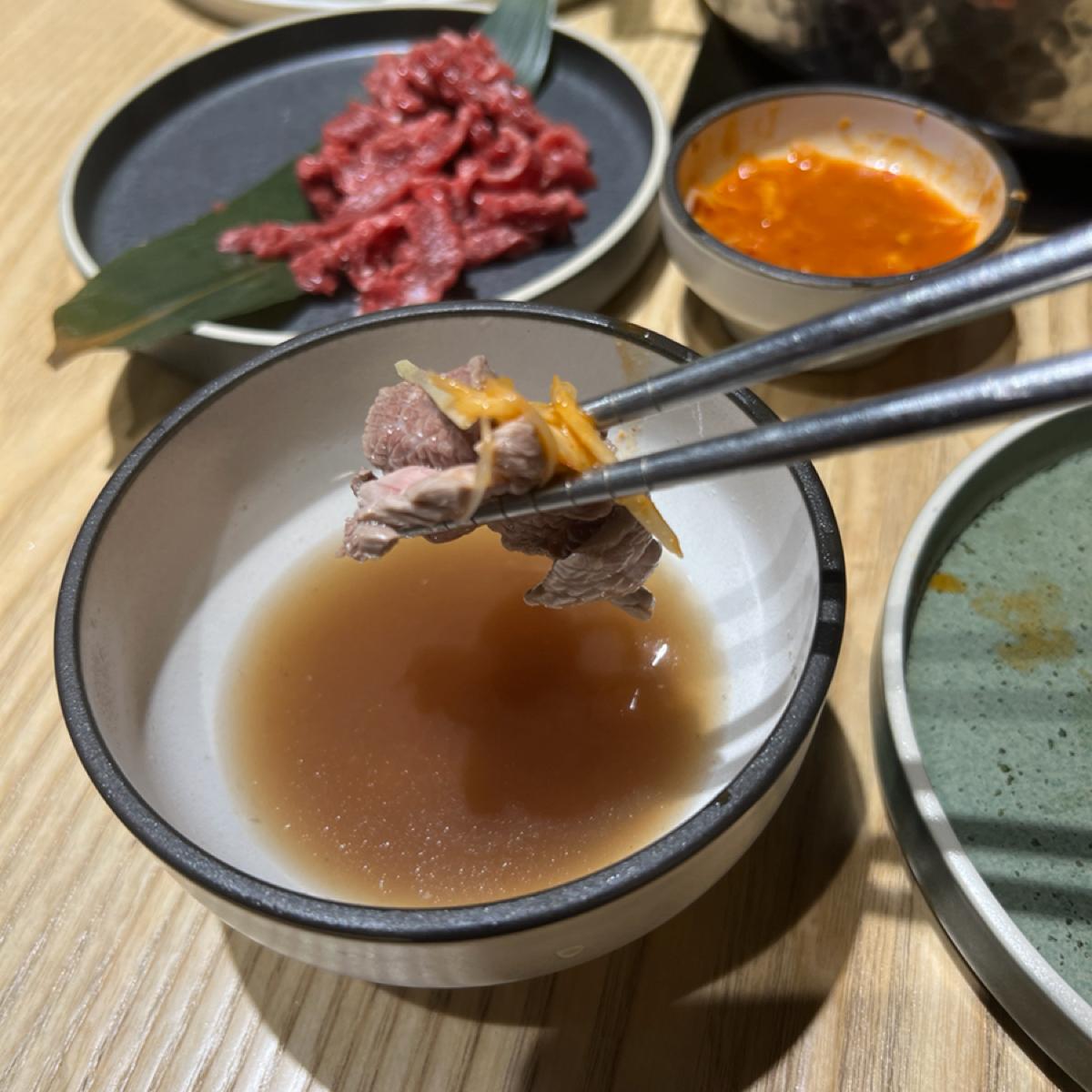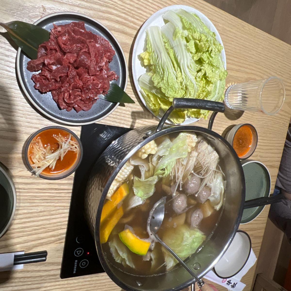 The environment is clean, comfortable, spacious, and bright. The soup base is fresh and sweet, and the vegetables are abundant. The limited beef was sold out, so I only ordered the regular beef, which has a nice texture and is quite tasty. The sauce is different from the typical sweet soy sauce in Tainan; it's a house-made mildly spicy sauce, and I can guarantee that the spicy peppers actually have some heat. Unfortunately, if you don’t eat spicy food, you can only choose the regular soy sauce, which is a pity. I forgot to take a picture of the beef offal, but it should be frozen and not fresh, though it’s very tender and also quite good. Business is doing well with the colder weather; the dining area was full and there was no time to answer phone calls. Thankfully, I was able to go nearby and book a later table to finally eat. There are also two large round tables in a private room and a rich variety of alcoholic beverages, including draft beer, so overall, it was quite nice.