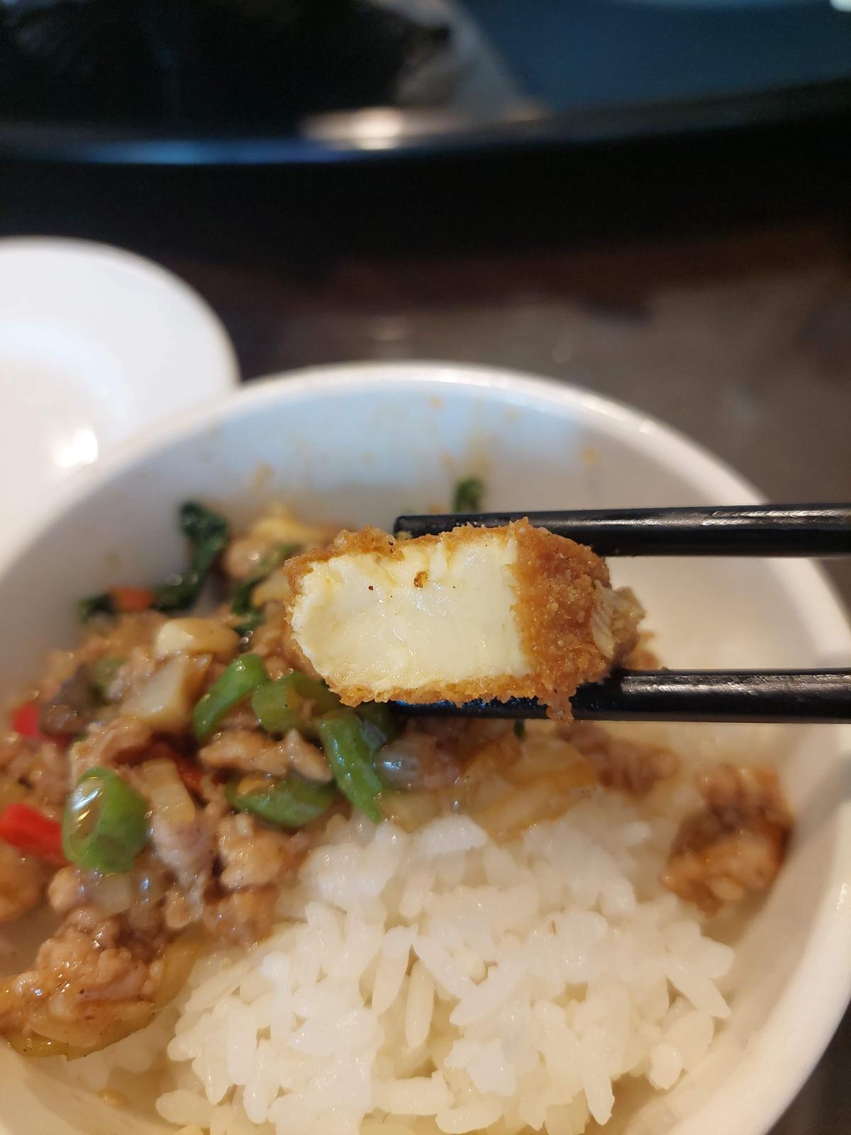 The tofu has a crispy outer layer and a smooth interior, and the salted egg yolk sauce is quite rich.