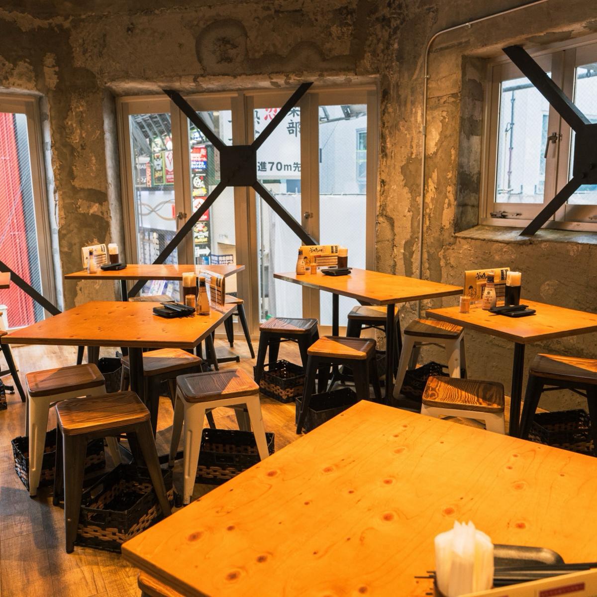 The space has a warm feel with a wood-based theme, but the walls are made of rugged concrete, and the bright lighting creates a casual atmosphere.