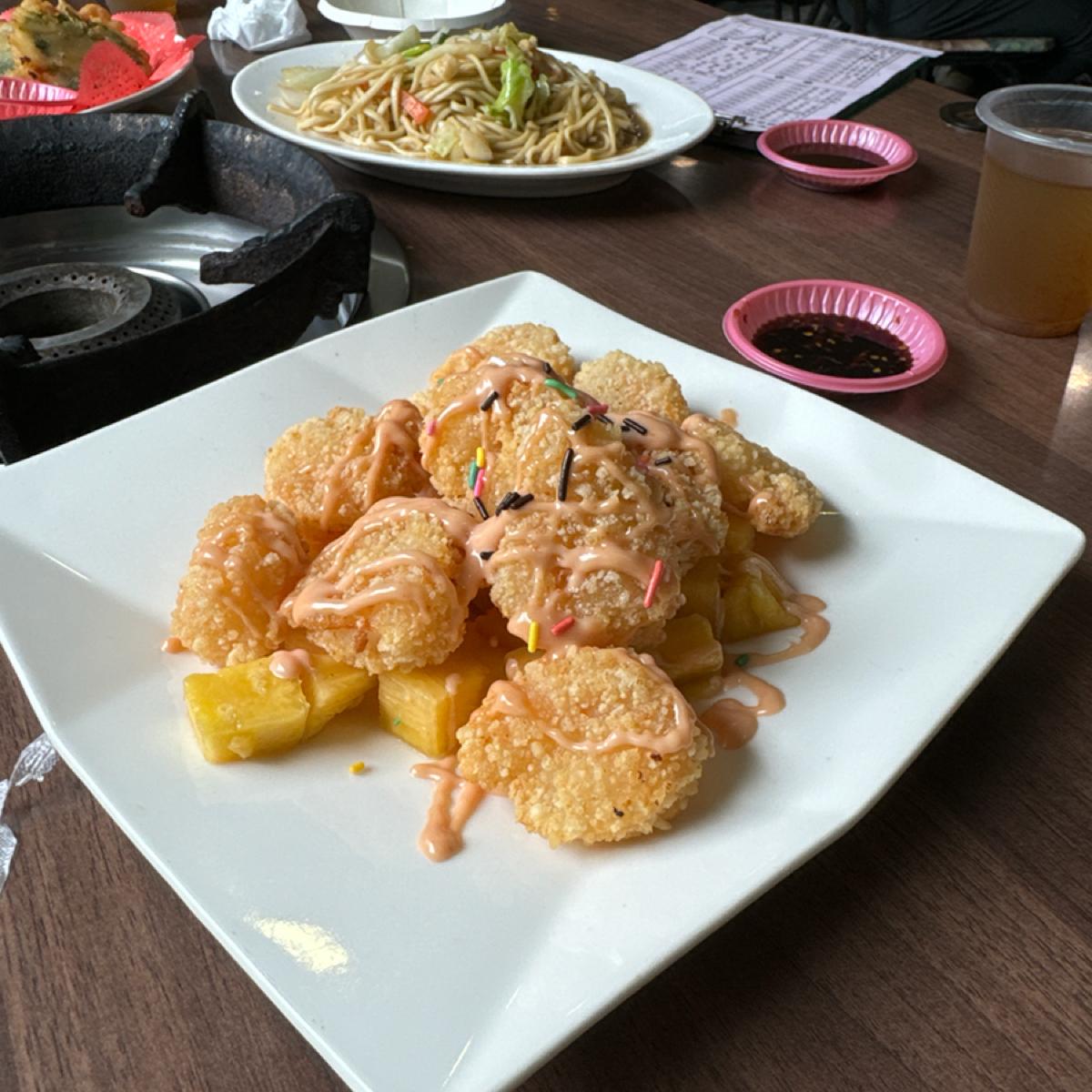 Secondly, the "Perilla Shrimp," which has shrimp paste coated in perilla leaves, then wrapped in batter and fried, is quite tasty. If you have to choose between that and the "Plum Pineapple Shrimp Ball," go for the Perilla Shrimp! The shrimp ball is just okay 😅, but its pineapple is real pineapple, not canned; the pineapple is pretty good! 🤣
