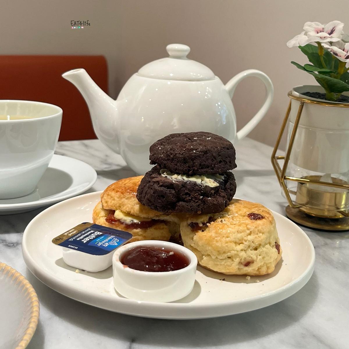 The scones come in two basic flavors: original and cranberry, with weekly limited flavors. I tried the chocolate one! The original flavor with butter and strawberry jam is excellent. They use salted butter, so there's a sweet and salty interplay, and you can taste a lot of strawberry chunks in the jam~ It's fantastic!