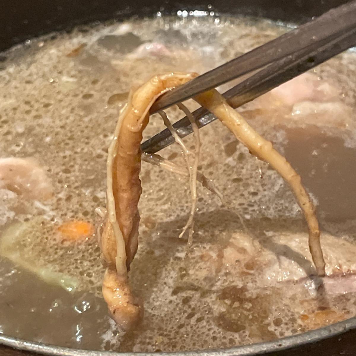 The soju hot pot comes with chicken, and the accompanying pepper salt really enhances the flavor! The broth has a strong alcohol taste, which is fragrant but rather bitter, with ginseng and Chinese medicinal herbs simmered in it. The vegetable platter is rich, including three clams, though the vegetables are not abundant. However, the black sesame glutinous rice balls and cheese balls do not pair well with the soju hot pot.