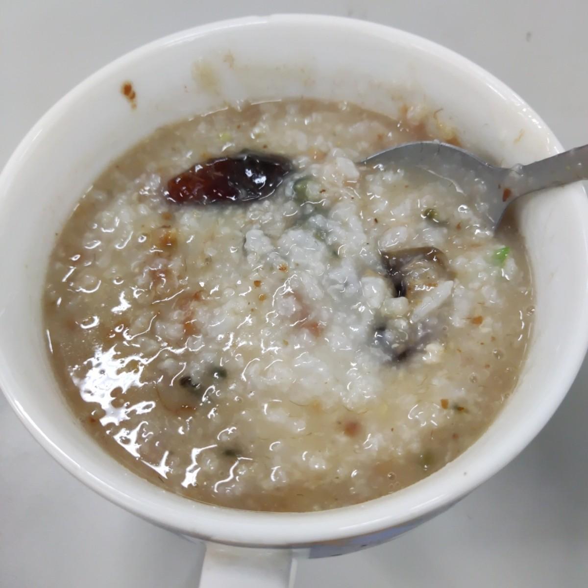 The item I buy most often is preserved egg and lean meat porridge. A large bowl only costs 45 yuan, that’s right, 45 yuan. The porridge is already cooked, with a whole preserved egg, a little chopped green onion and meat floss added.