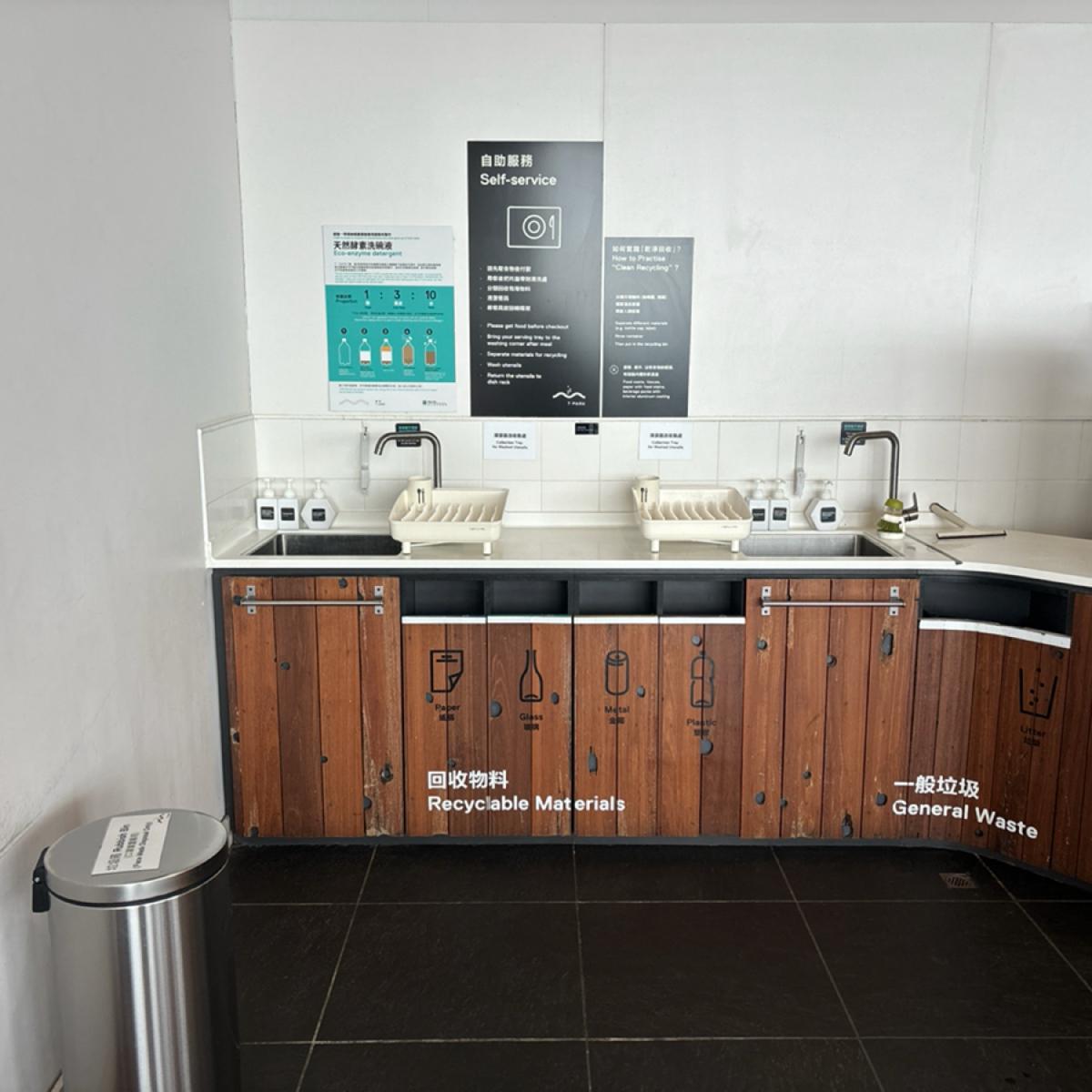 The theme wall of "Source Tea" contains messages promoting environmental protection and energy conservation. Customers are required to sort materials and clean dishes by themselves.