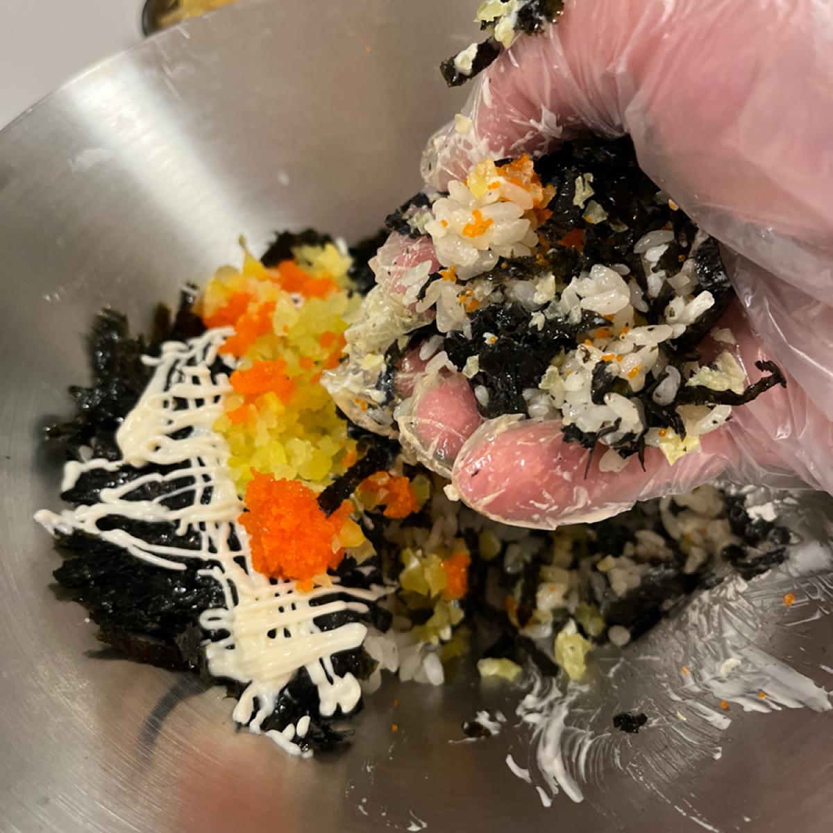 The rice is hand-picked. It’s full of seaweed. It doesn’t look like a lot, but it’s actually not too little. The rice is not sticky and comes with fish eggs. You have to catch it or it will fall apart. The whole thing is cold and you can eat it in big mouths.