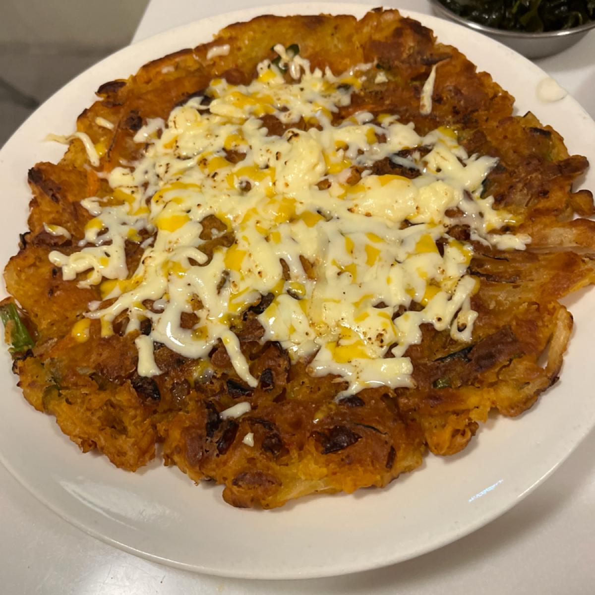 Cheese and kimchi pancakes, the crust is crispy and delicious, the kimchi flavor is not very strong, the cheese and crust taste more obvious, visual inspection should be about the size of a 7-inch pizza