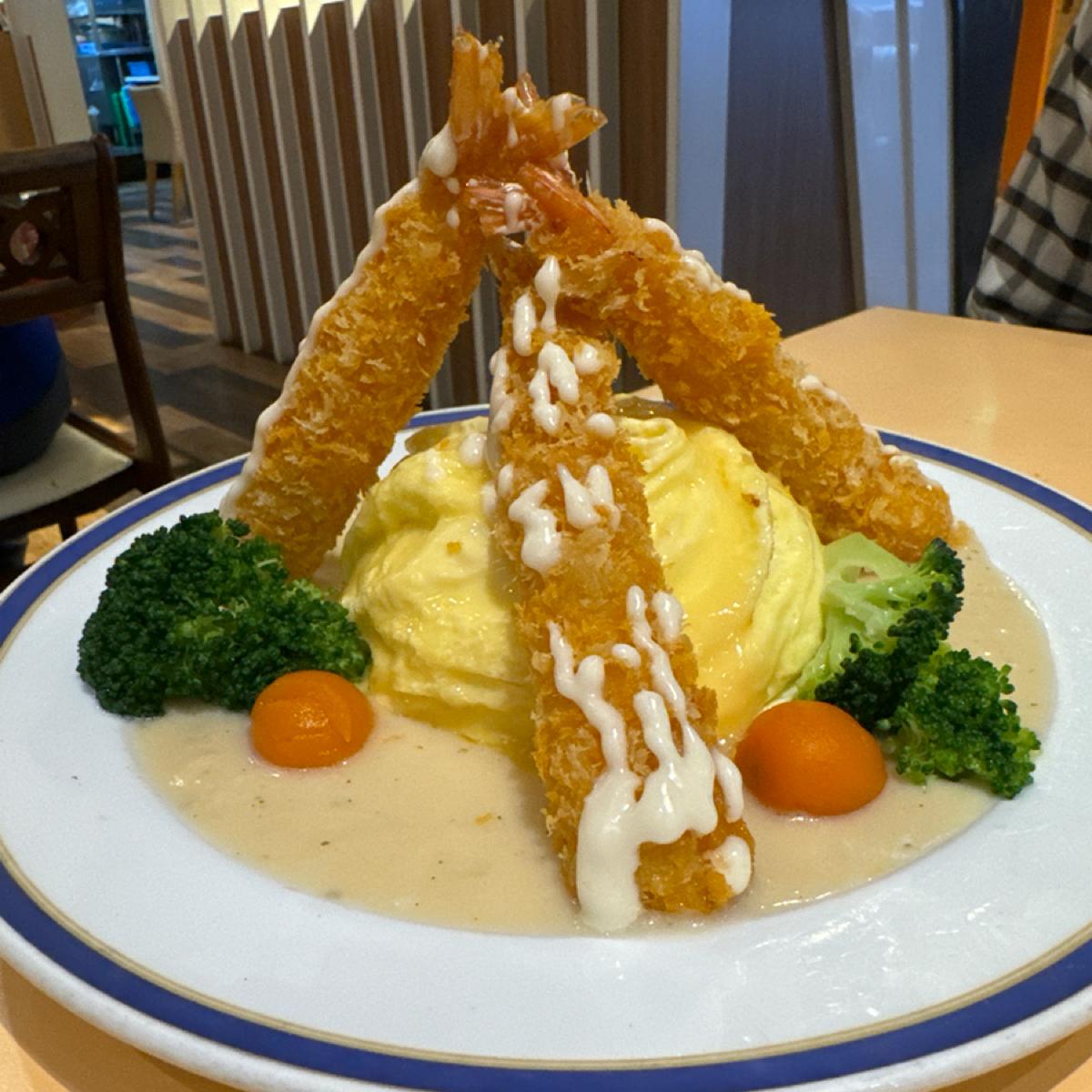 Yumi fried omelet cream rice NT$300 - This is the first time I have eaten cream rice, and I can’t describe its taste very accurately. It doesn’t have a particularly creamy taste, but it’s not as rich or cheesey as white sauce. It's very heavy, just a mediocre performance. There are three fried shrimps. The outer skin is relatively thick and hard, which makes it taste better. The shrimp meat inside is not big and average.