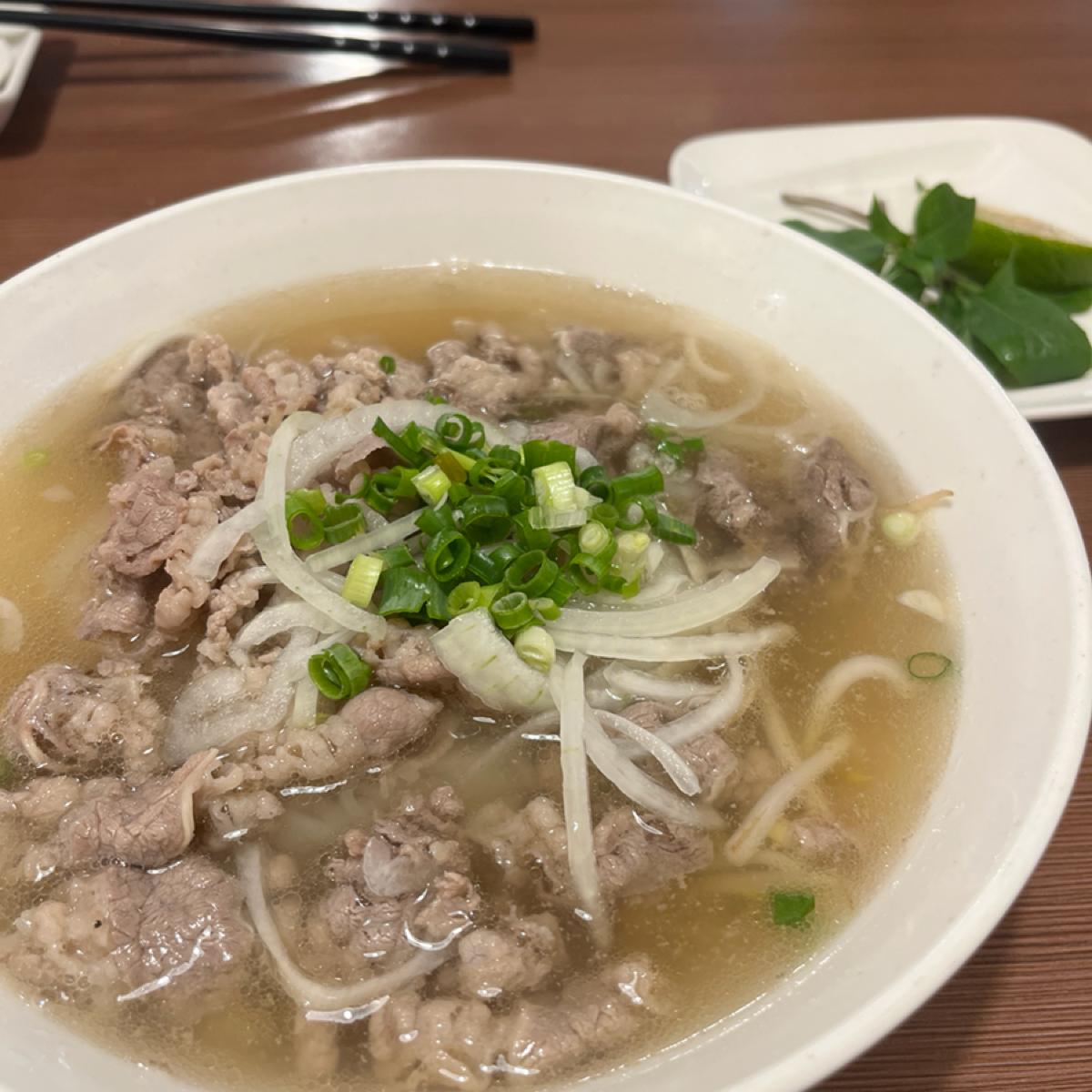 This time, I went alone, and considering the portion sizes, I didn't order my favorite "beef pho with both brisket and meatballs" but opted for the lighter "rare beef pho." The broth was clear yet substantial, exuding a natural sweetness from slow-simmered beef bones, with a hint of the gentle warmth from onions. It's the type of dish that you can eat bite after bite without getting tired of it. The rare beef was cooked perfectly, tender, fresh, and completely free of fishiness. The rice noodles were wide, chewy, and elastic, not soggy, and absorbed the flavorful broth superbly.