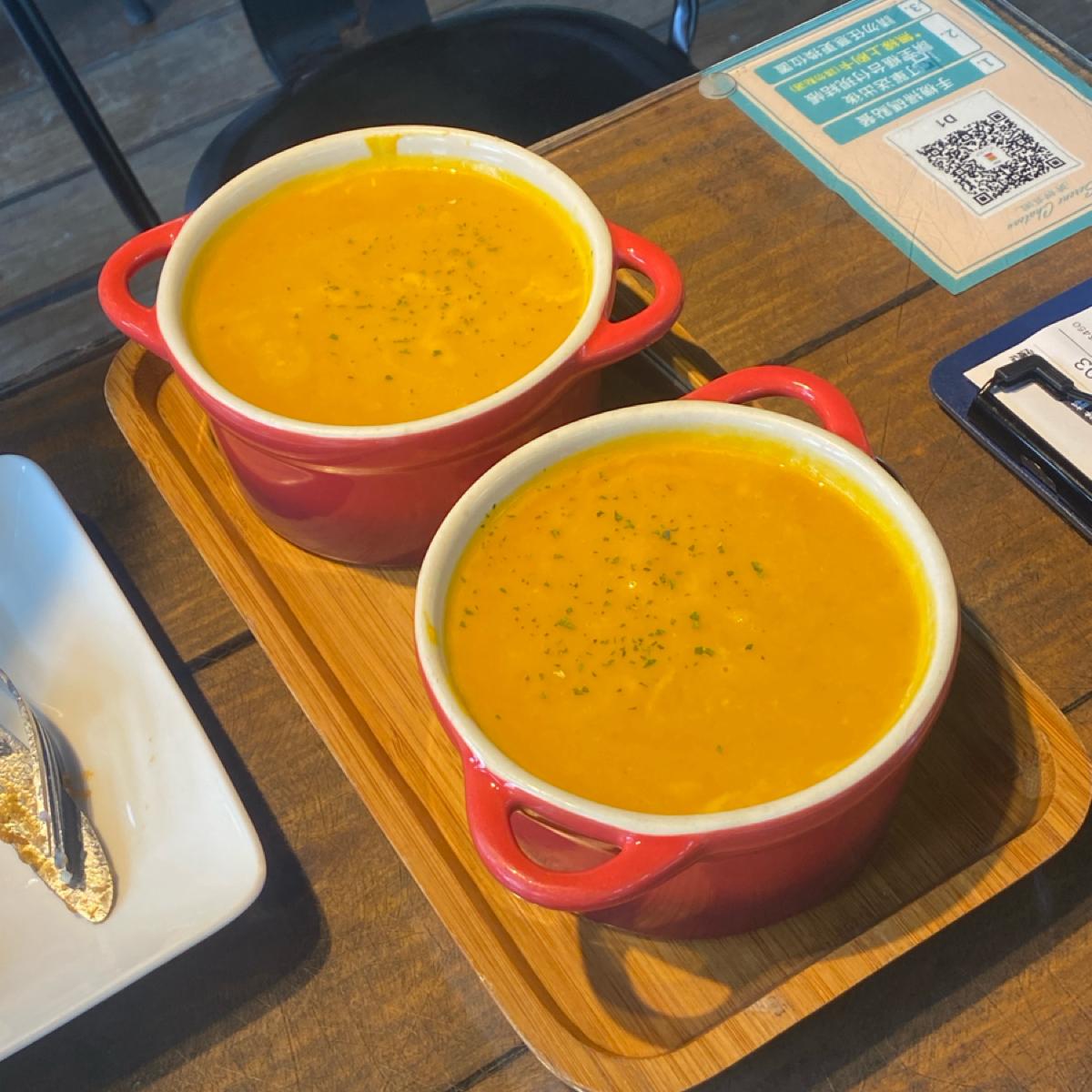 There are three different kinds of bread, and the pumpkin soup is just thick enough and well-seasoned, making it very tasty. The bread pairs excellently with the soup!