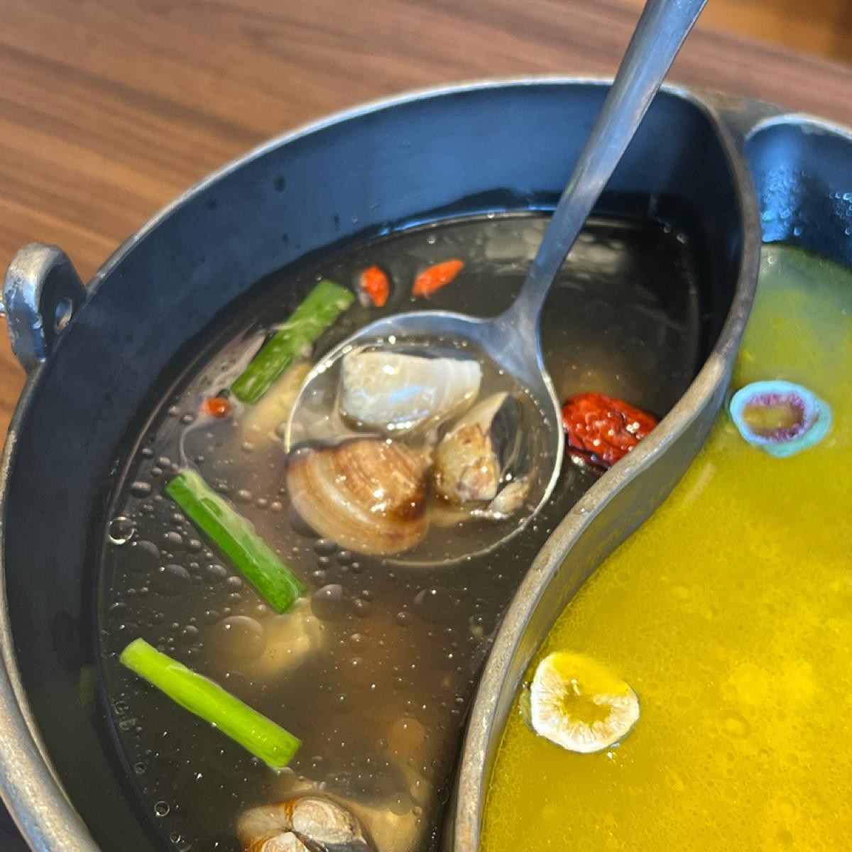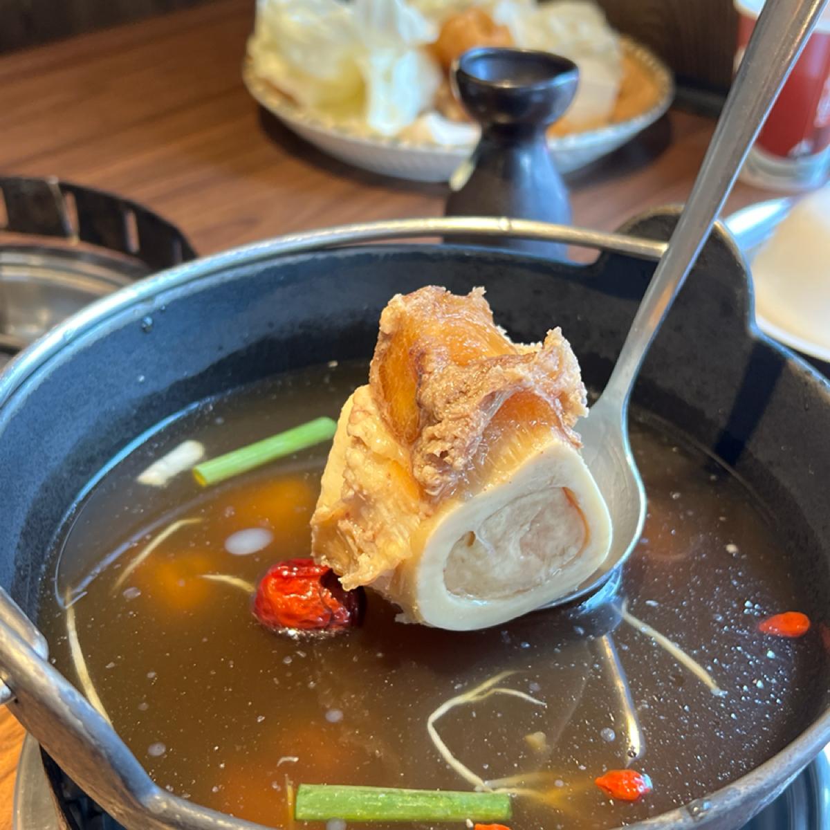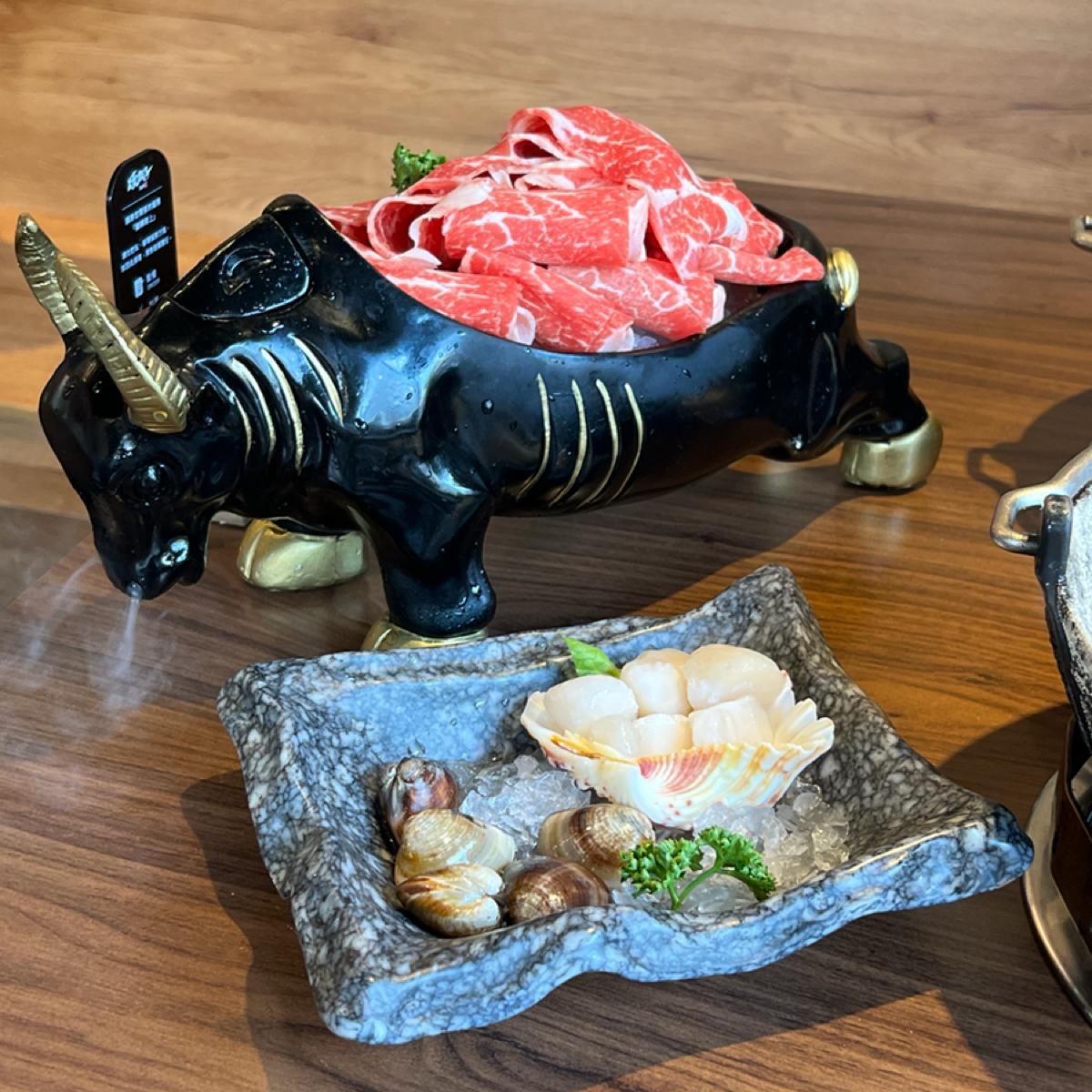 The broth is made from beef bone soup, and it includes a big chunk of bone marrow. The meat options include Prime ribeye and Angus shoulder chuck, both of which are tender. For seafood, there are small scallops and fresh clams that are very plump and fresh, making them very enjoyable to eat.