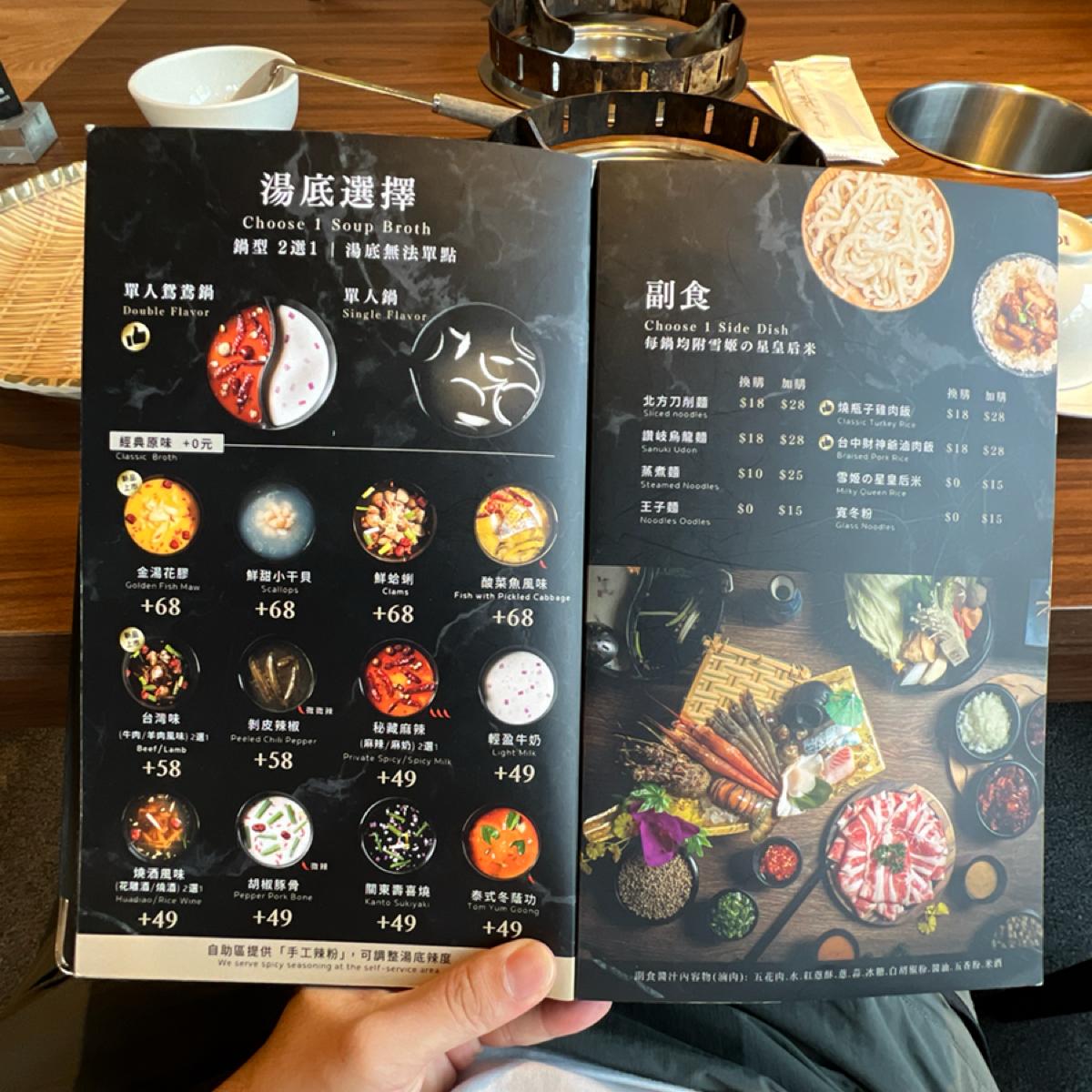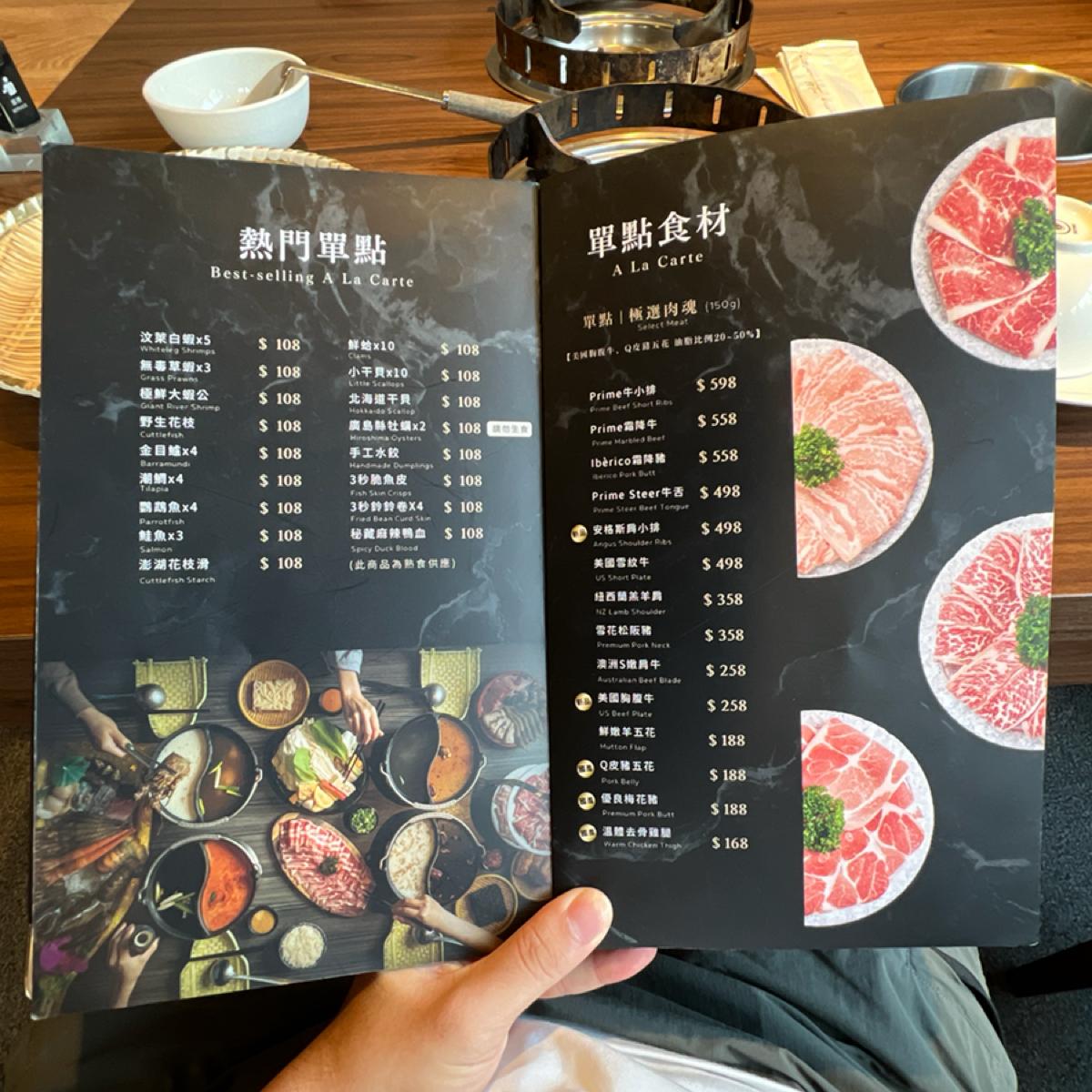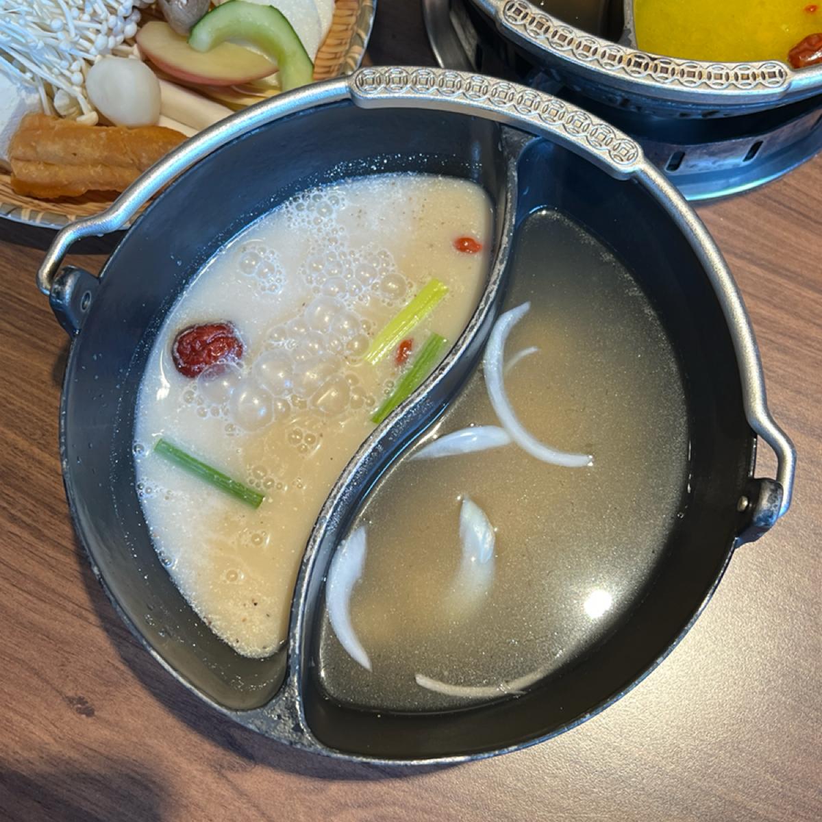 The broth is made from beef bone soup, and it includes a big chunk of bone marrow. The meat options include Prime ribeye and Angus shoulder chuck, both of which are tender. For seafood, there are small scallops and fresh clams that are very plump and fresh, making them very enjoyable to eat.