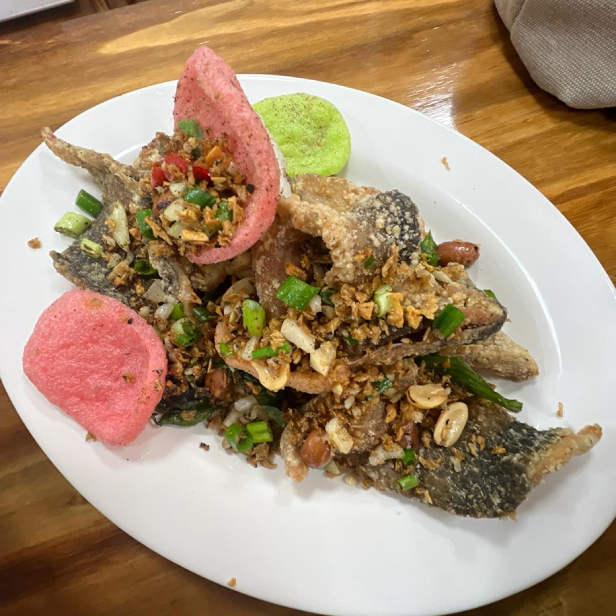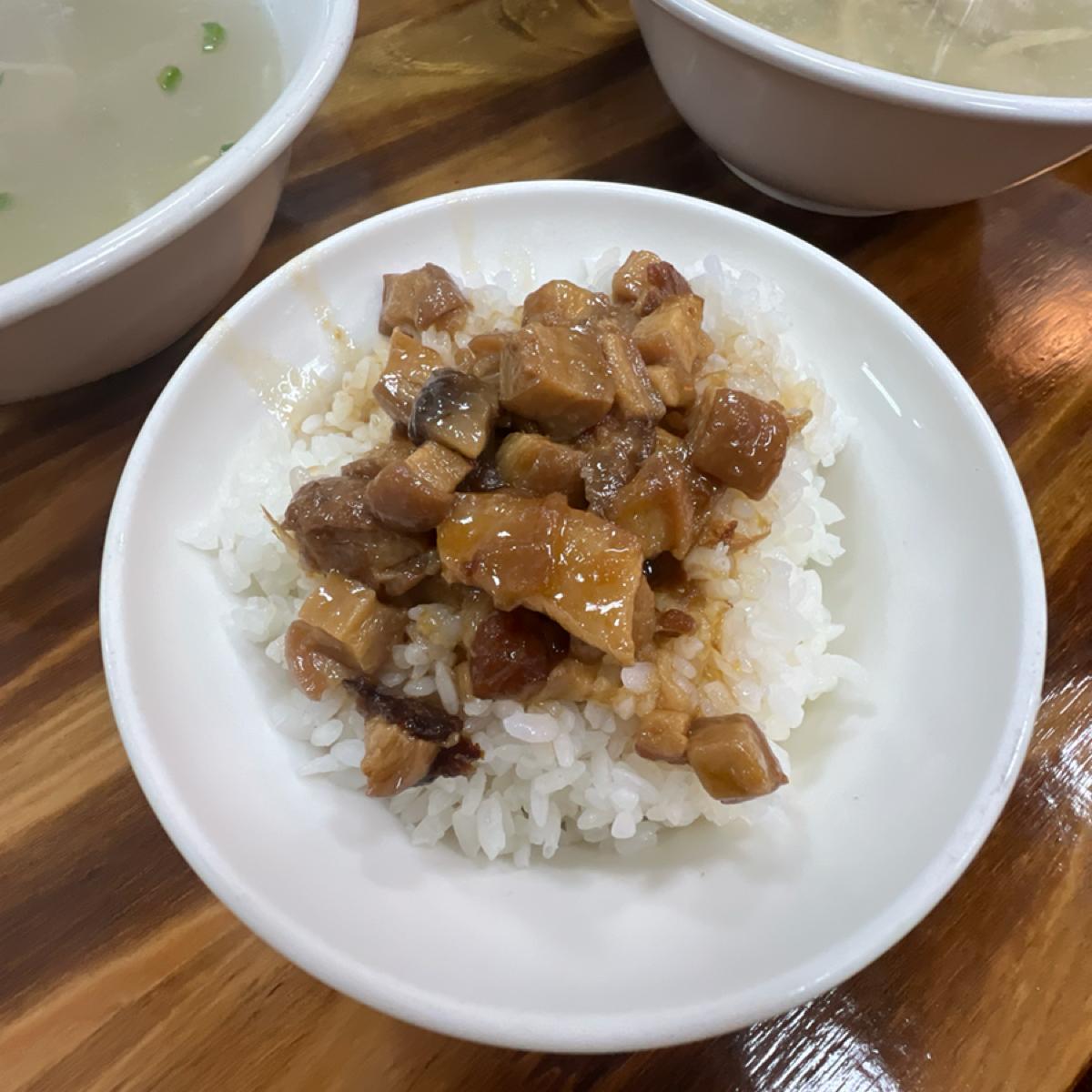 The signature fish soup features very fresh fish, and the broth is refreshing with a hint of sweetness, without any fishy smell, making it quite pleasant to drink. Paired with a bowl of minced pork rice, the sauce isn’t too greasy and complements the fish soup well, making it above-average in deliciousness. If you spend over 200 NT dollars, they also give you a plate of vegetables, which seems reasonable in terms of pricing. I remember that in the past, spending over 100 NT dollars would earn a plate of vegetables too; I wonder if I’m mistaken, but with rising prices, I can understand the change. Last time, I wanted to order fried dough sticks, but I recall that they were a bit pricey, so I didn’t get them. This time, I ordered the fried fish skin, which was very tasty, with a wonderfully crispy texture! However, it was slightly salty, but that’s a minor issue.