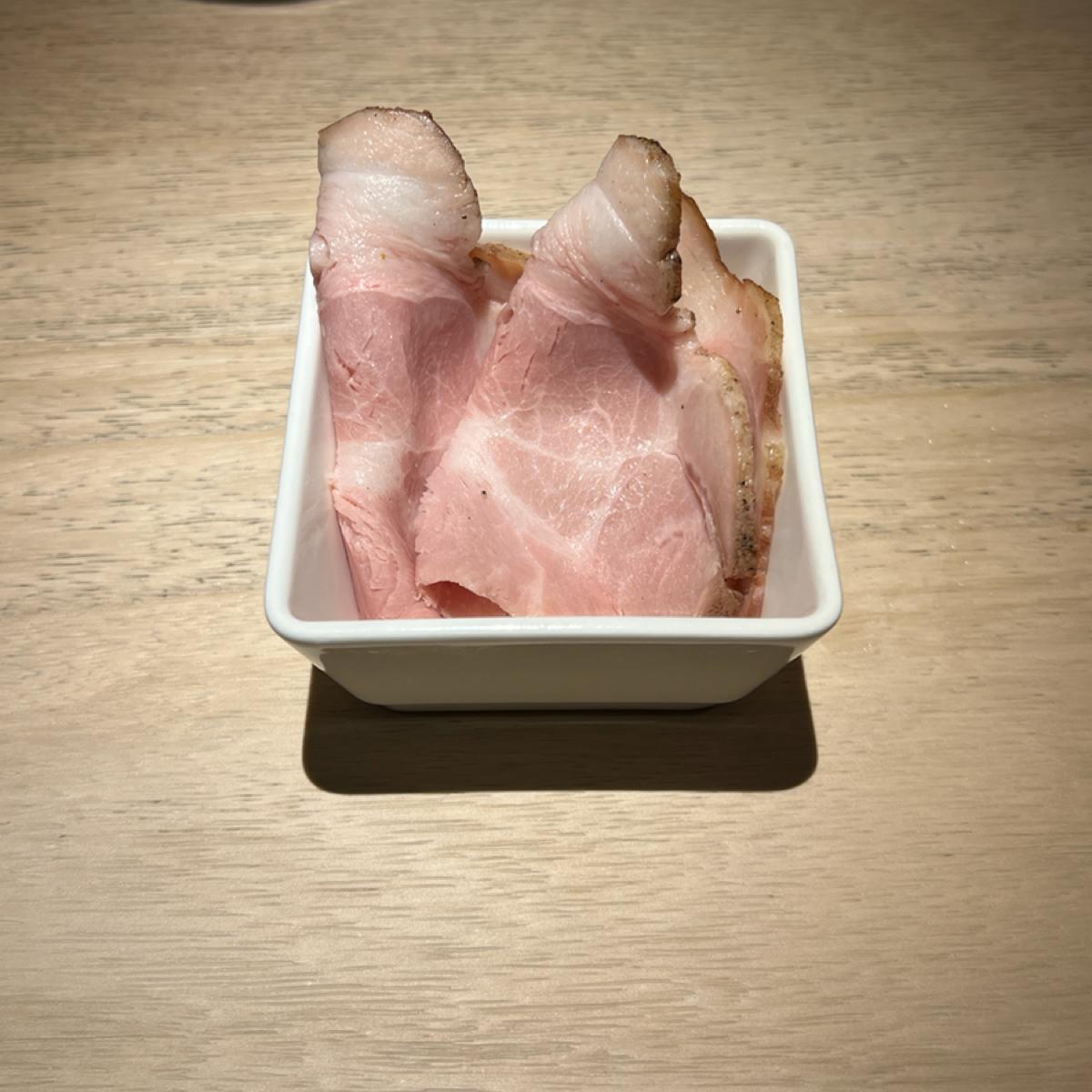 The noodle dishes in the shop are divided into three categories: salted chicken clear soup, salted chicken white soup, and delicate chicken broth. The staff mentioned that the chicken white soup is lighter at lunchtime than in the evening, so I ordered the salted chicken white soup ramen. The only options are no green onions and no garlic, while the firmness of the noodles is fixed. The chicken white soup has a rich chicken flavor; at first sip, it doesn’t feel overly greasy, but the soup is thicker with a smaller amount. The sous-vide chicken breast lacks flavor on its own, but it pairs nicely with the chicken white soup. However, the char siu (braised pork) performs excellently, being tender and flavorful. This time, I received two extra pieces of random char siu, making the overall meat portion quite sufficient.🤣 Additionally, the white cap on the table contains chili powder, which spicy food lovers can add. The rich chicken white soup becomes even smoother with a bit of spice, which can help prevent it from becoming too greasy by the end.
