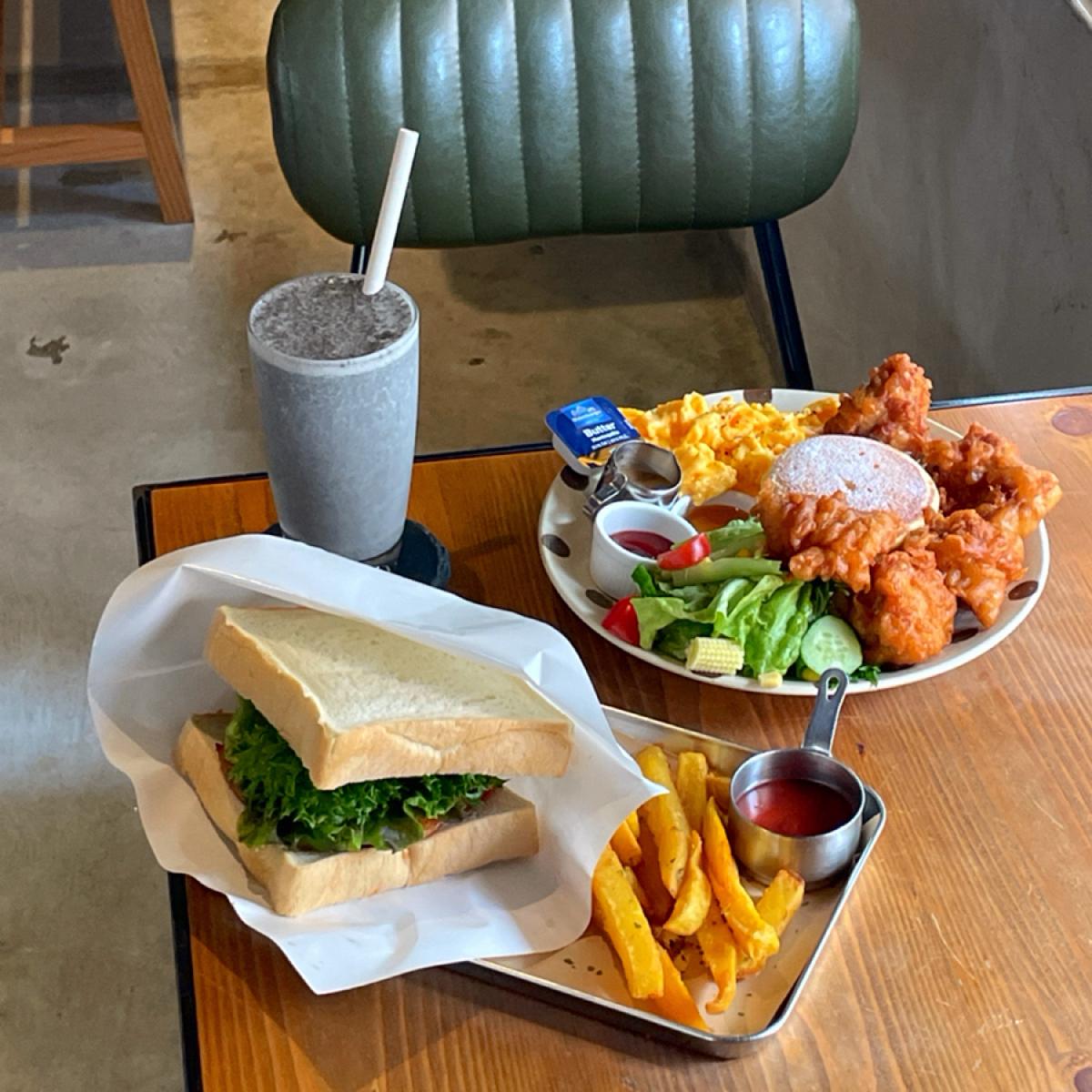·The contents are waffles, lettuce salad, scrambled eggs and fried tangyang chicken. This tangyang chicken is so delicious that I still miss it. It’s crispy, juicy and nearly perfect. I love it more than the waffles. The waffles are also soft and delicious. ! Paired with cream and honey, it’s salty and sweet. I like it very much.
