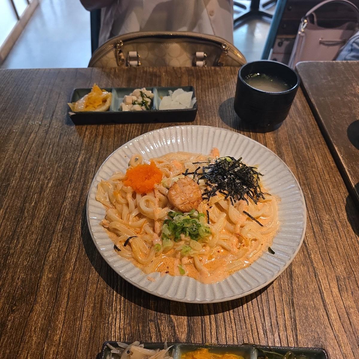 This time, we ordered their signature dish, "Spicy Cod Roe Udon with Scallops," which is indeed deserving of its popularity! The chewy udon is coated in rich cod roe sauce, complemented by seared scallops that are incredibly fragrant. The first bite has a slight spiciness combined with the creaminess, creating a rich flavor profile—so good that I wanted to order another bowl! Paired with a refreshing shochu cocktail, it’s simply the perfect combination, refreshing and palate-cleansing. Not to mention, they have a hidden menu item in their online ordering system called "Salmon with Yuzu Udon," which isn’t listed on the paper menu—a delightful surprise! The salmon is fresh, and the yuzu adds a refreshing taste, making it particularly appetizing in summer. I recommend it to friends who prefer lighter flavors.