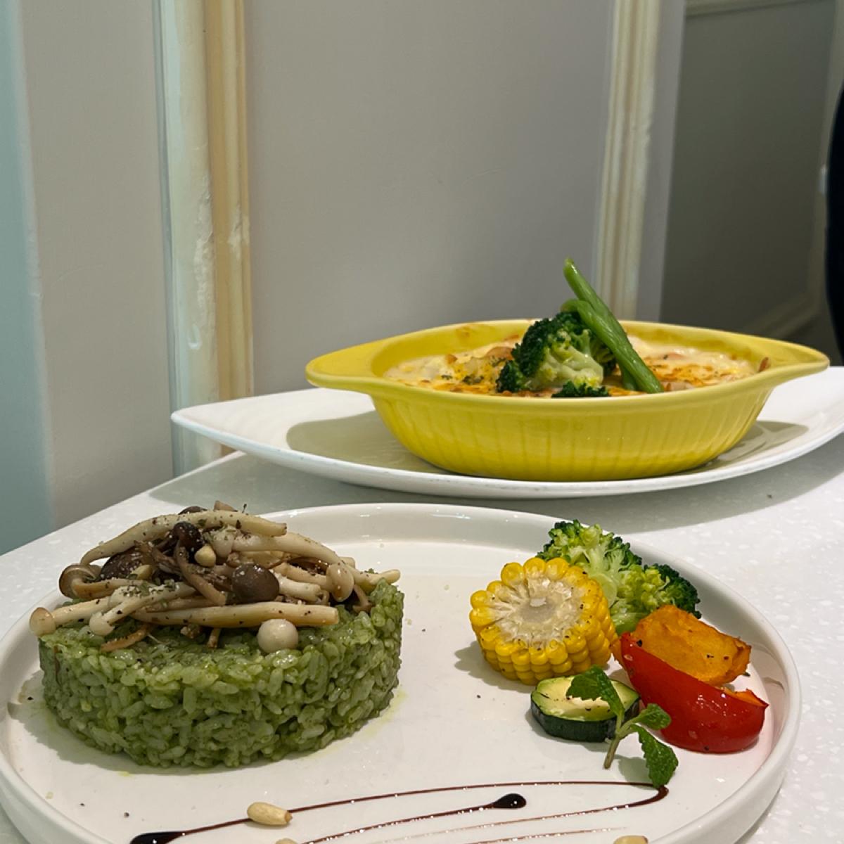 This dish is vegetarian. The pesto flavor is very rich, but the seasoning leans towards salty. The flavor of the shiitake mushrooms is more balanced, but personally, I found it a bit lacking.