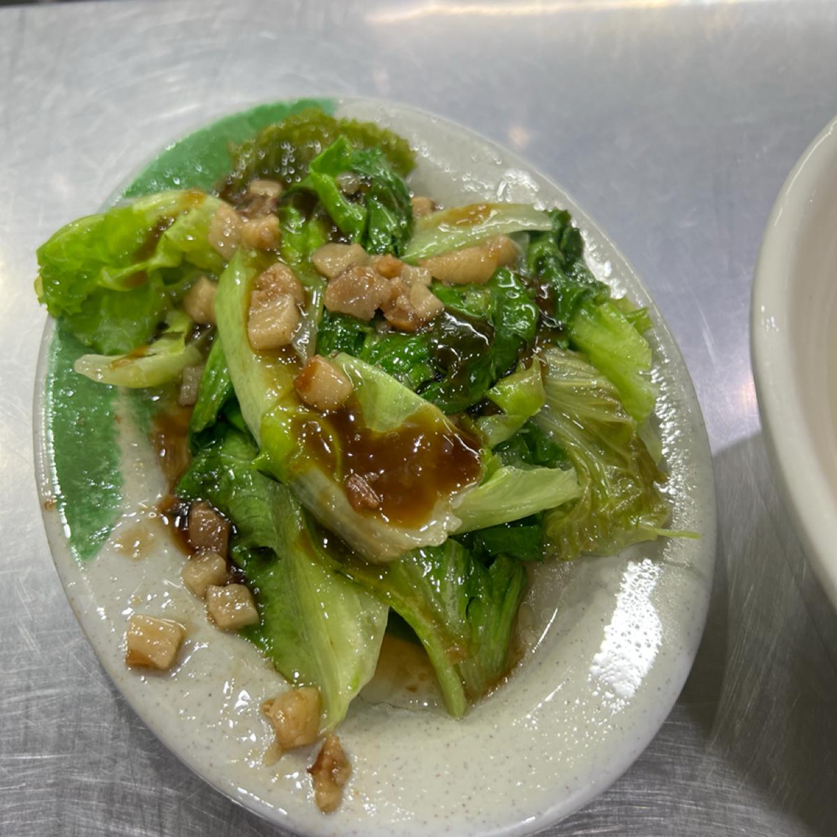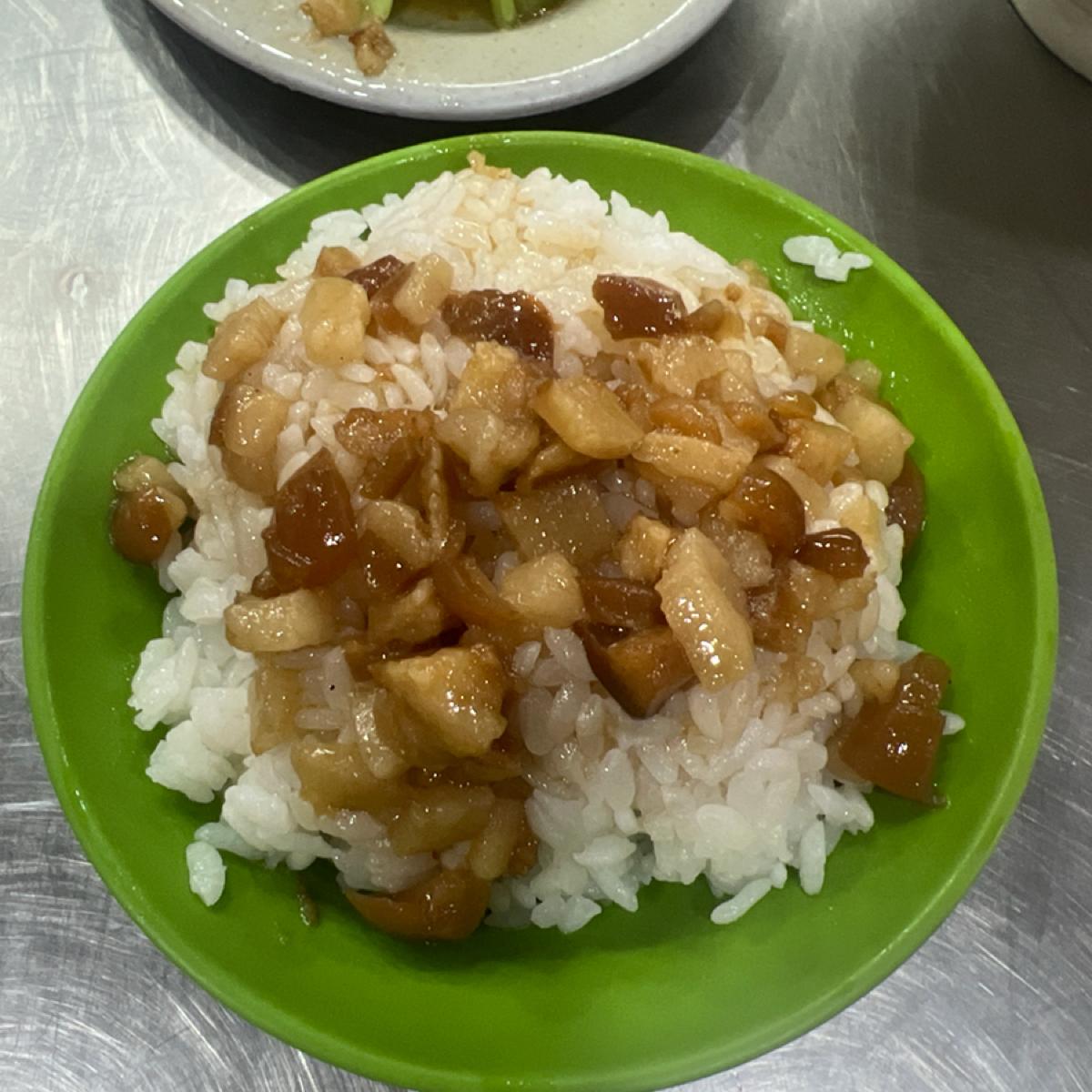 If you order the meat soup with rice, it feels filling, as it includes radish, scrambled egg, and cilantro. However, the braised pork rice (small NT$30) has a sauce primarily made from pork skin, with not much lean meat. Although it has a sticky, gelatinous texture, the seasoning is quite salty and lacks a bit of sweetness at the end. The steamed greens (NT$30) are basic; there’s nothing particularly amazing, but they meet the standard.