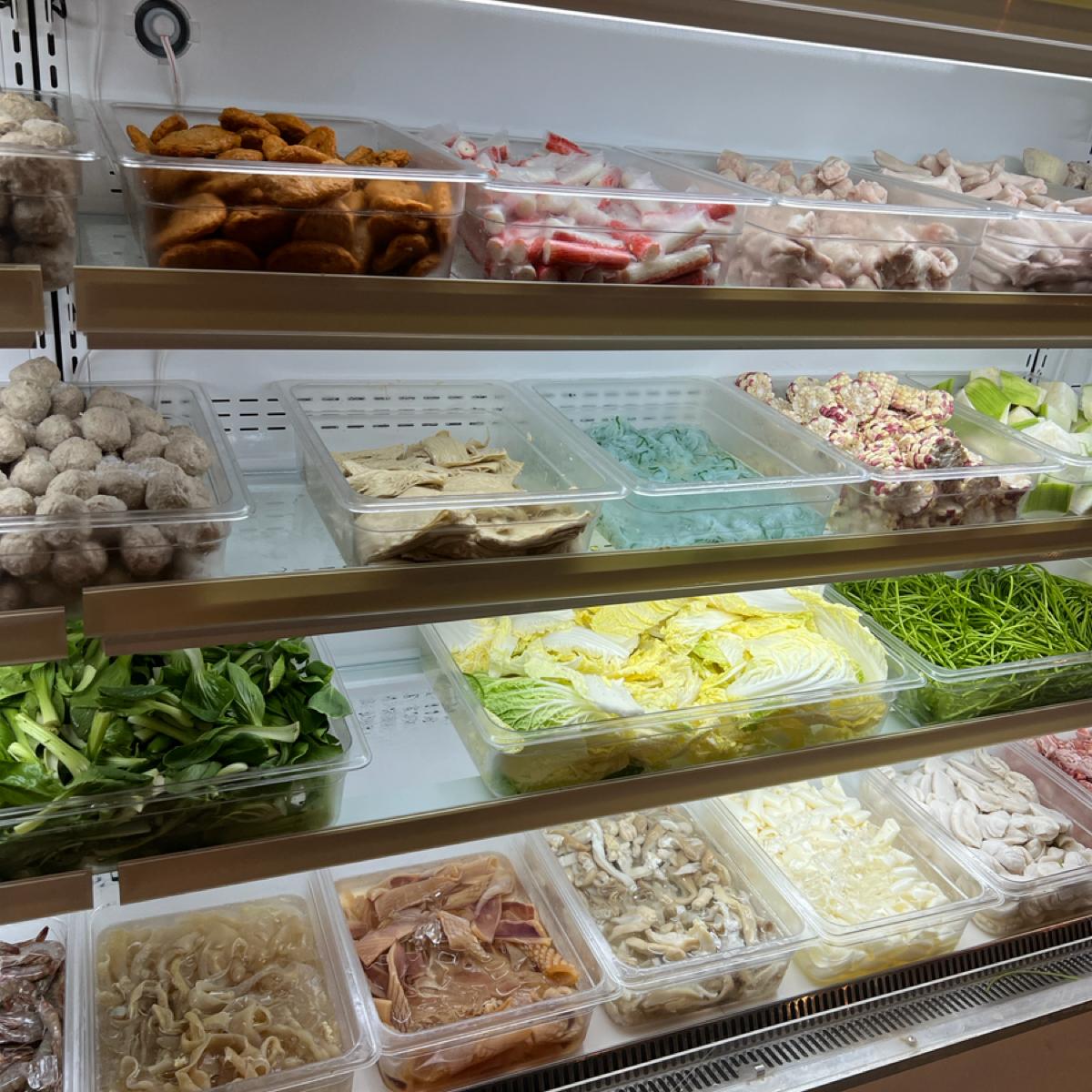The self-service hot pot section includes ingredients, vegetables, and sliced meat,