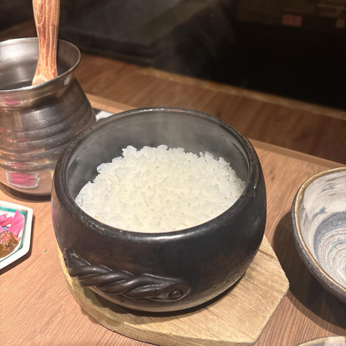 Rice cooked in a clay pot with Hachidaime Gibe rice and pickles