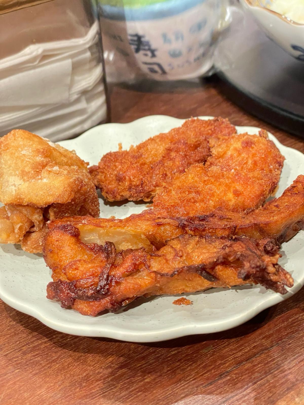 squid tempura and one fried wonton.