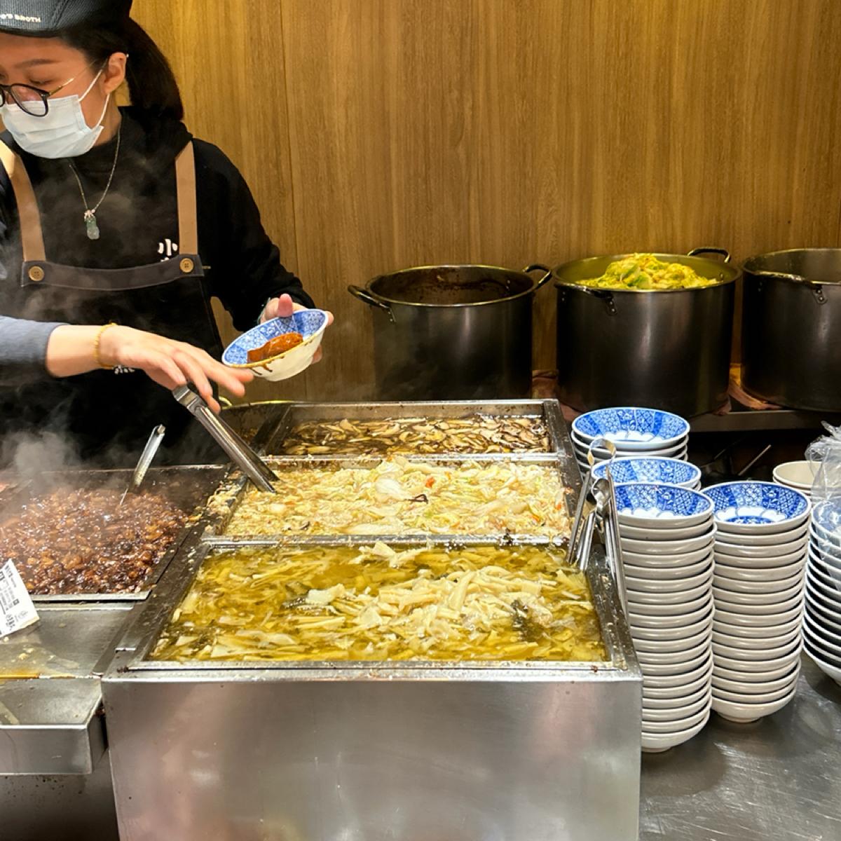 The two of us ordered two bowls of meat-free rice, braised cabbage, shredded bamboo shoots, tofu, fried tofu, and melon pork in clear soup.