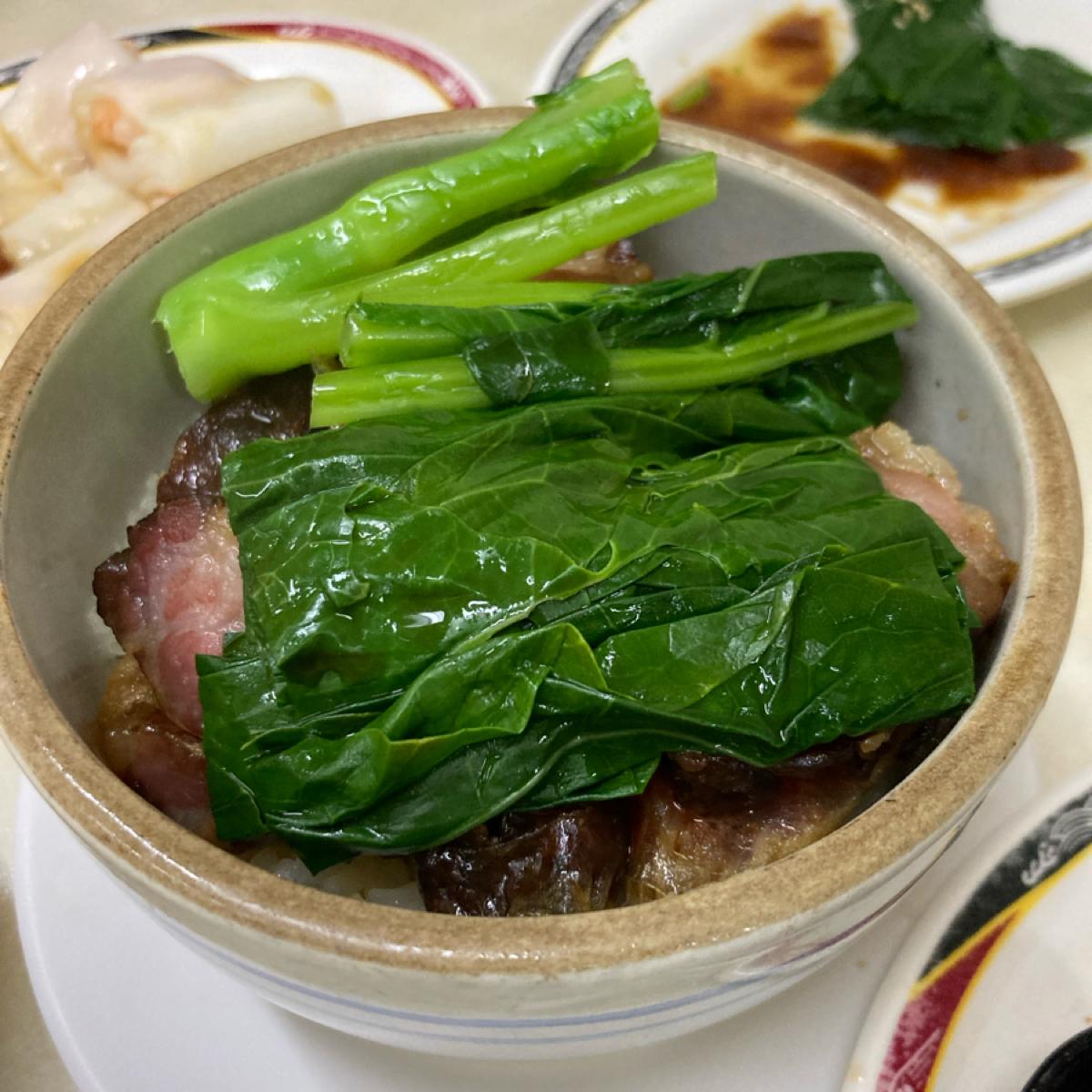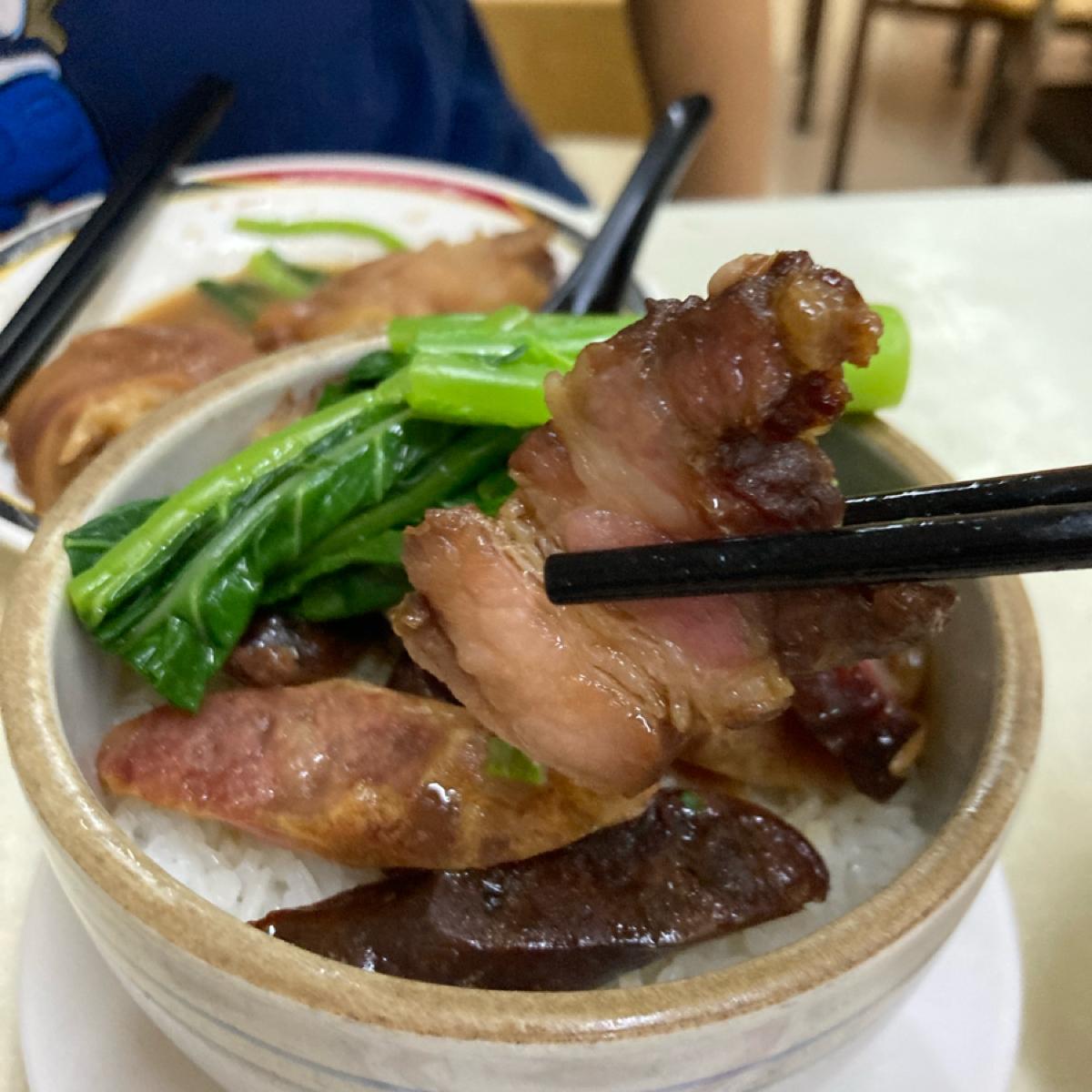 It's a very authentic Hong Kong-style restaurant, and not expensive. This is my first time here, and I ordered the Cantonese preserved meat rice. After eating it, I understood why every table had someone ordering the original claypot; it was really delicious, especially the rice, which was cooked just right, making me want to eat it continuously. It came with some vegetables, and the preserved meat rice had three types of meat: two sorts of sausage and one piece of preserved pork, which had the right balance of fat and lean meat, well-seasoned without being overly greasy or too salty; the seasoning was just right, which I really liked.