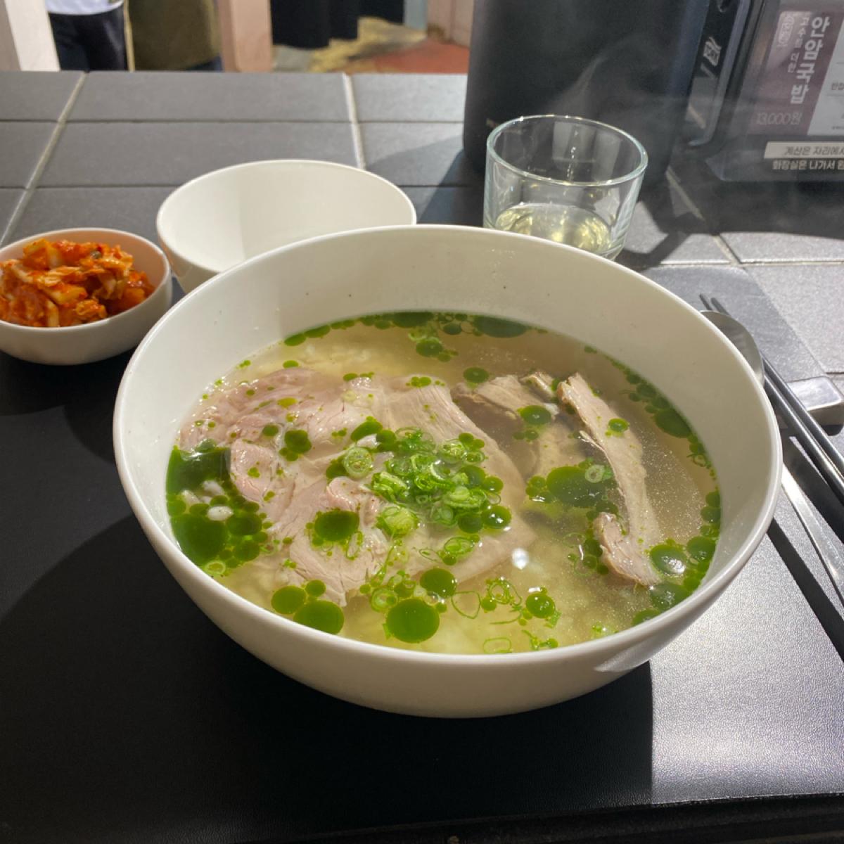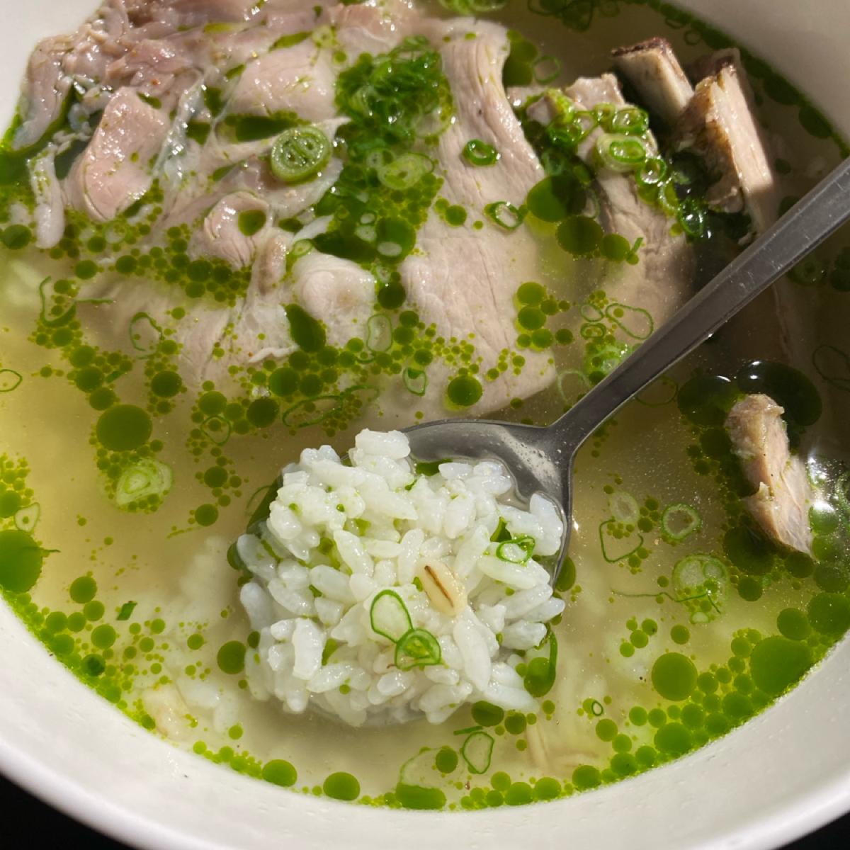 The menu is kept simple, offering rice soup and sliced pork. There is a lot of pork in the soup rice, including both meat slices and pork ribs. The meat slices are very soft and tender, and the pork ribs feel more filling. There is some unknown green oil added to the soup, which gives the whole bowl of soup and rice a light aroma and a little bit of spiciness. In addition to white rice, the rice also has a little barley, which adds a different taste.