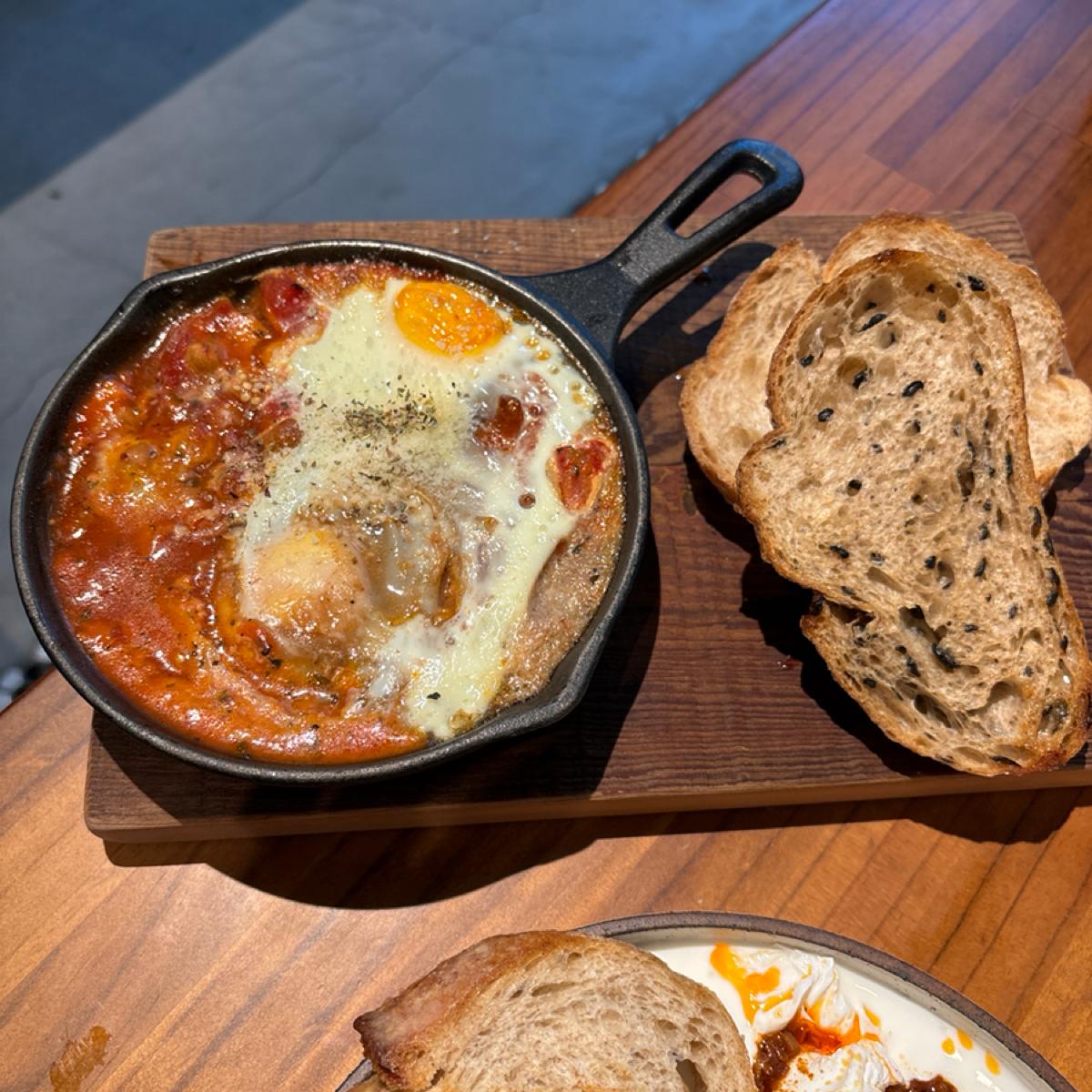My thoughts after eating are that the food tasted just as I imagined ~ It wasn't very impressive, but the ingredients did seem quite fresh. The bread 🥯 next to the counter looked better than the meals 🤔. Unfortunately, since I booked in advance, we didn't get a table that could accommodate us, otherwise, we could have ordered a pizza 🍕. With two meals served, there wasn't enough space for even a jug of water on the table.